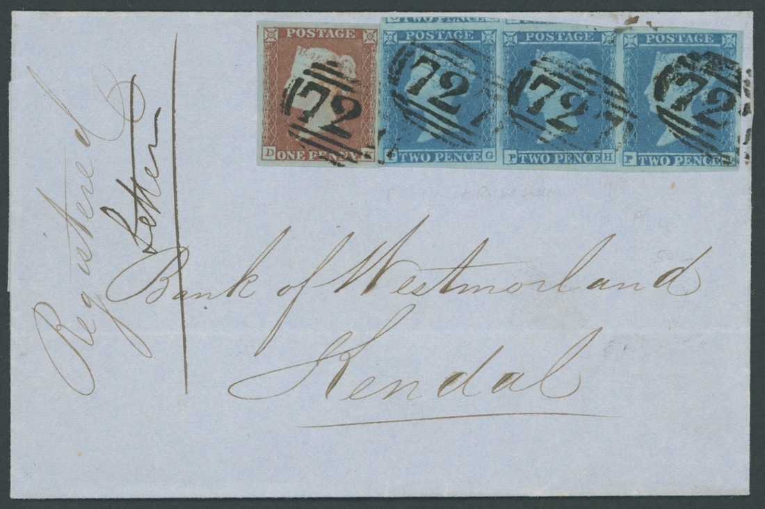 PG-PI strip of three affixed overlapping 1841-53 1d. red-brown, DK, and tied by '727' barred numeral to 1841 (21 Aug.) entire registered from Spalding to Kendal, endorsed "Registered Letter", the reverse with Spalding, London and Kendal d.s. B.P.A. Certificate (1996).  Fine and scarce.