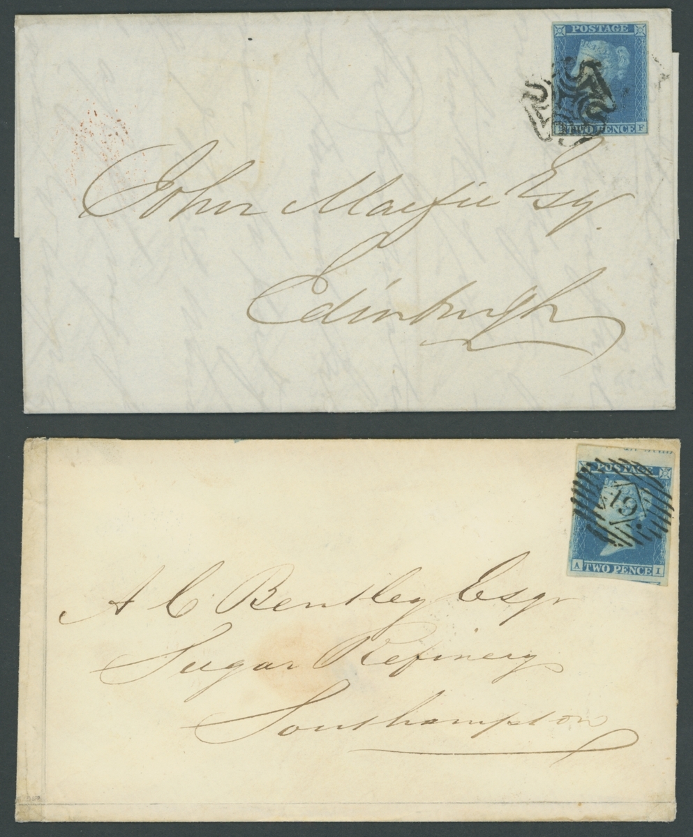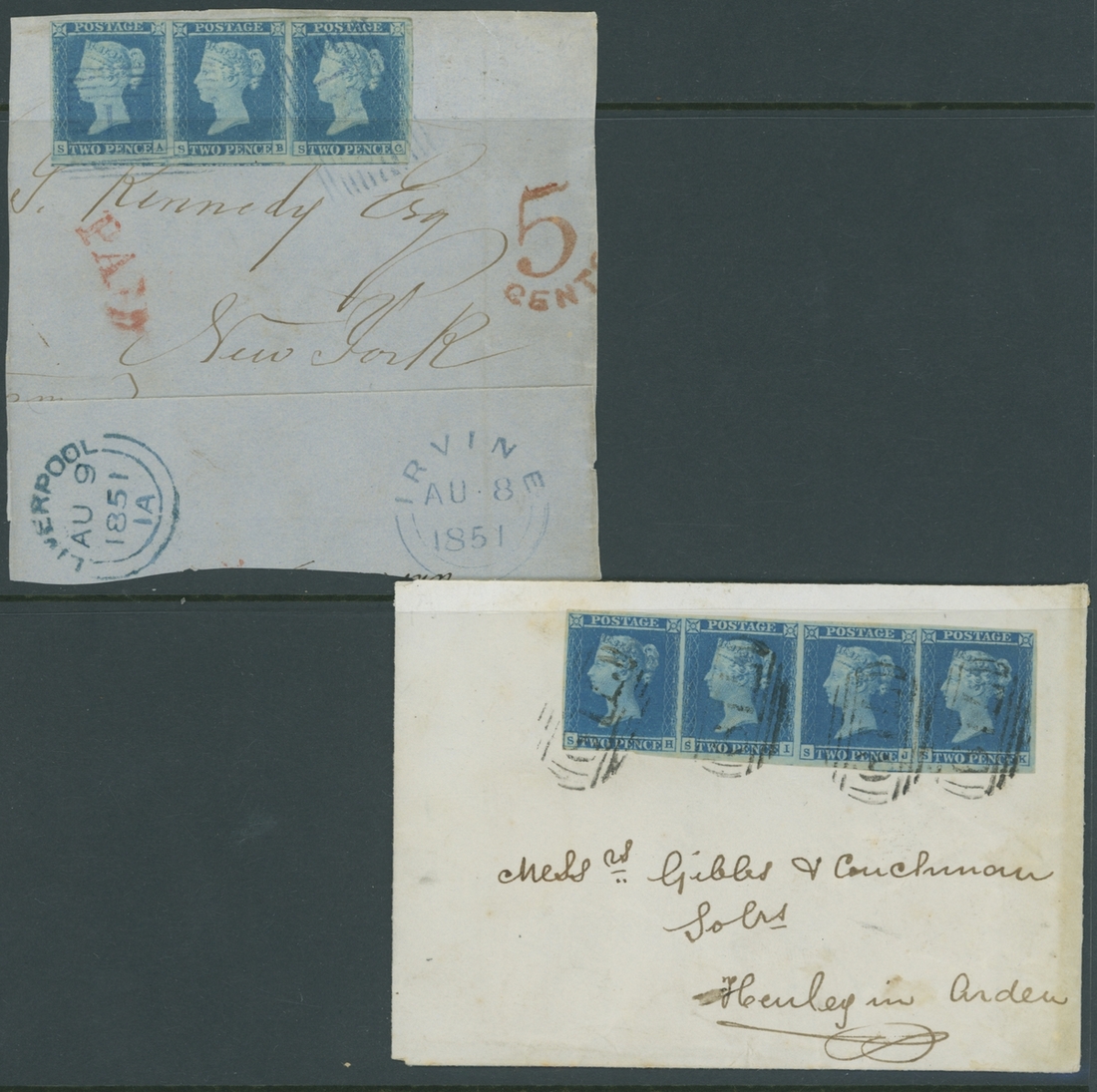 A scarce used group including horizontal strip of three, pairs (3) and single, all with clear margins all round, one pair with large portion of adjoining stamp at right, 1851 (8 Aug.) piece from Irvine to New York bearing strip of three tied by '18' barred numeral in blue, piece struck with "