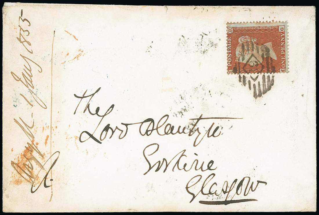 MG, placed sideways and cancelled by London inland "39" barred oval cancellation,  on envelope to Glasgow, dated 2 Jan. 1855, addressed to Lord Blantyre; centred to upper left, otherwise fine and scarce. S.G. 16d
