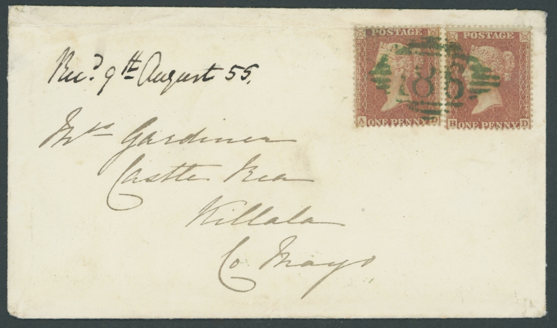 1d.  AD and BD, tied by a single green "186" in diamond of Dublin to envelope to Co. Mayo,  dated markings of 9 Aug. 1855 on the reverse; the envelope slightly refolded for exhibition purpose. Fine. S.G. 21