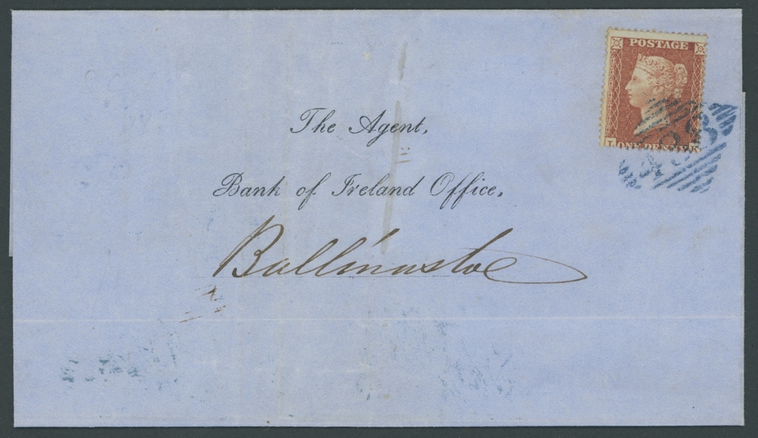 1d. Plate 1: LK,  tied by blue "438" diamond of Tullamore leaving the Queen's profile clear, to blue entire addressed to Ballinasloe, dated markings of 9 Aug. 1855 on the reverse; patched seal holes on the reverse; fine. S.G. 17/18
