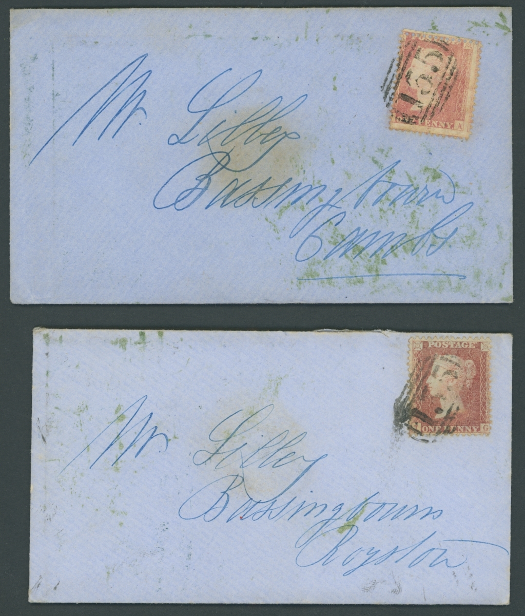 1d., six used on five entire letters or envelopes, including two on forwarded entire, SE on envelope to Aberdeen with green "159" numeral of Glasgow, three from the same correspondence with undated circle of  Bourne (blue or green) on reverse, etc.; good to fine