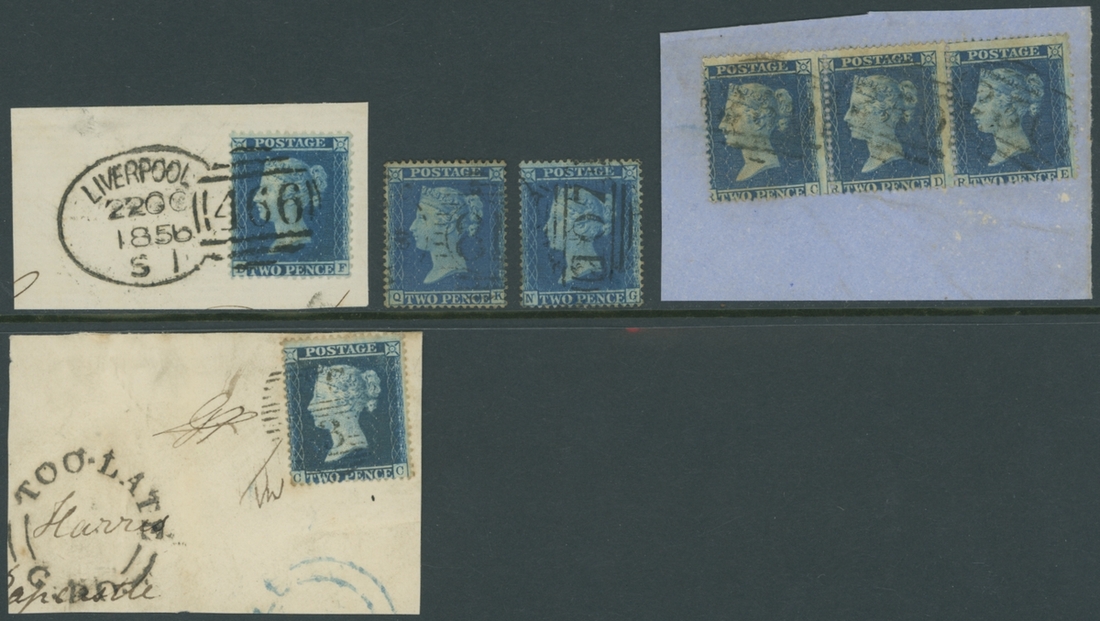 2d. Plate 5: DF, tied to piece by Liverpool Spoon cancellation,  1858-58 2d. perf. 16 two singles, single on piece with double ring "Too Late/G.P.O." alongside, strip of three on piece; good to fine. S.G. 34, 36a