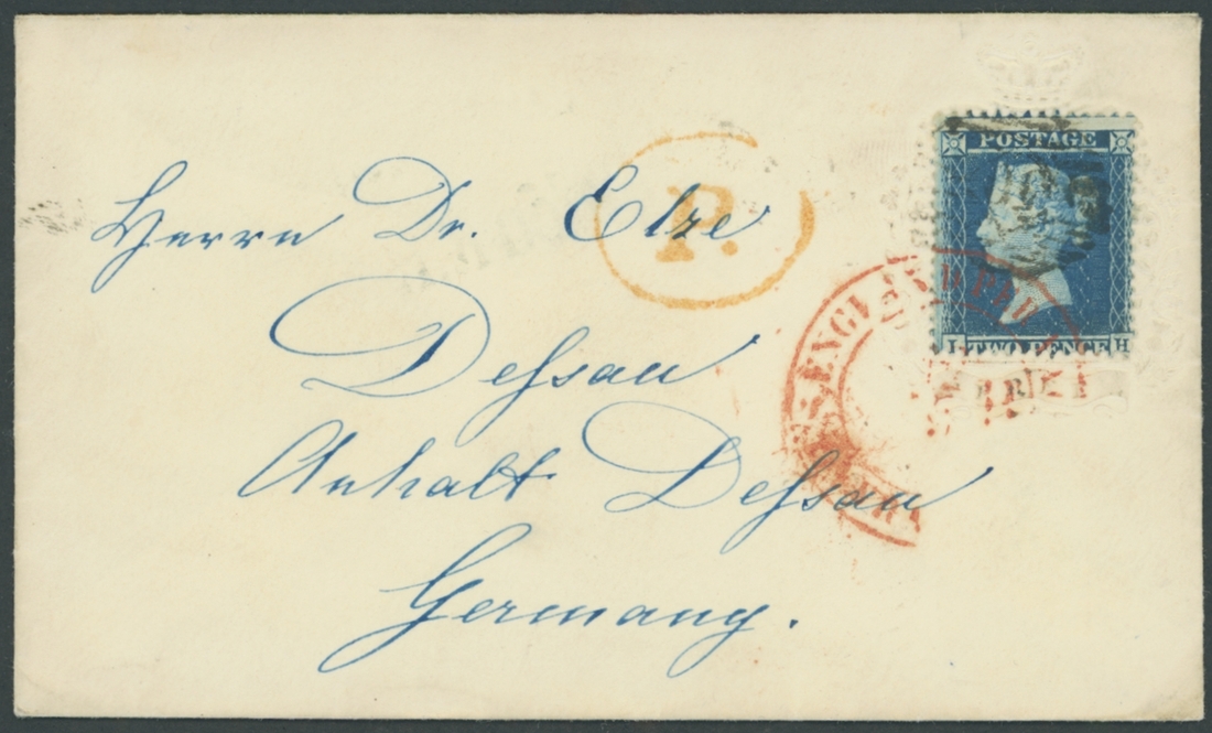 2d., Plate 5: IH, tied to embossed (Crown)/"FREE" envelope addressed to Germany,  red transit datestamp additionally ties the stamp and red "P" in oval alongside, dated markings on the reverse; fine and attractive