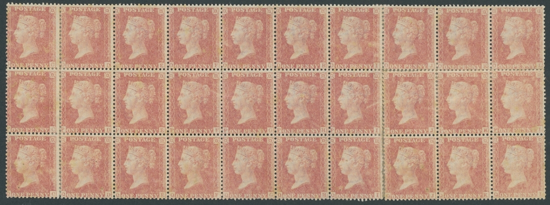 Plate 38: OC-QL pale rose shade,  block of thirty, large part original gum with toning and some creasing, rejoining and rebacked vertically between OI-OJ to GJ-QK, and horizontally from QJ to OL, nevertheless a rare multiple. Specialised C9 (3) £12,750