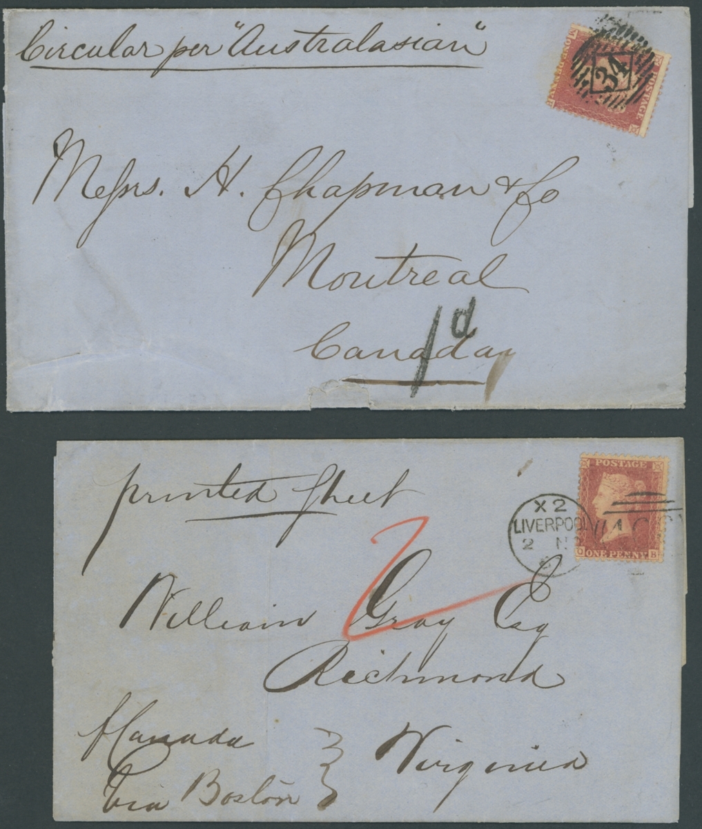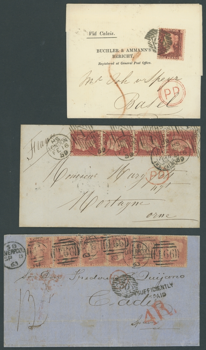 1d., five items addressed overseas, comprising single on Newspaper wrapper Basel,  vertical strip of four with Rideout "1" cancellations on envelope to France, horizontal strip of six on entire to Spain, single on large part wrapper to Canada, single on entire to Virginia, endorsed printed sheet/P Canada/Via Boston; chiefly good to fine