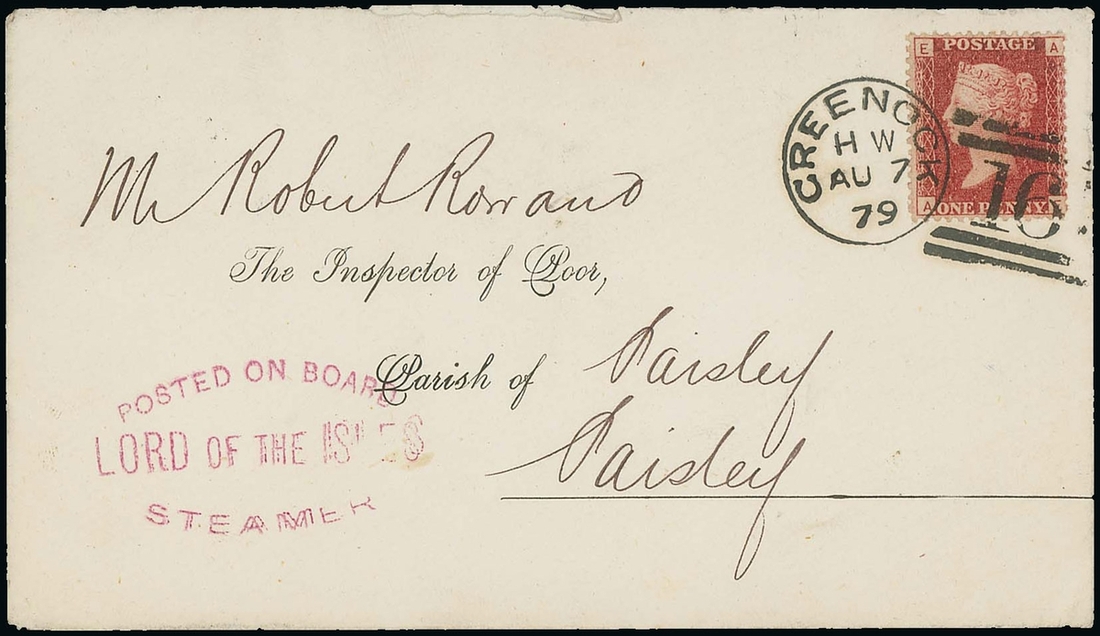 Plate 190: AE tied by Greenock '167' dulpex to 1879 (7 Aug.) envelope to Paisley, carried on and posted aboard the Lord of the Isles and with magenta cachet "