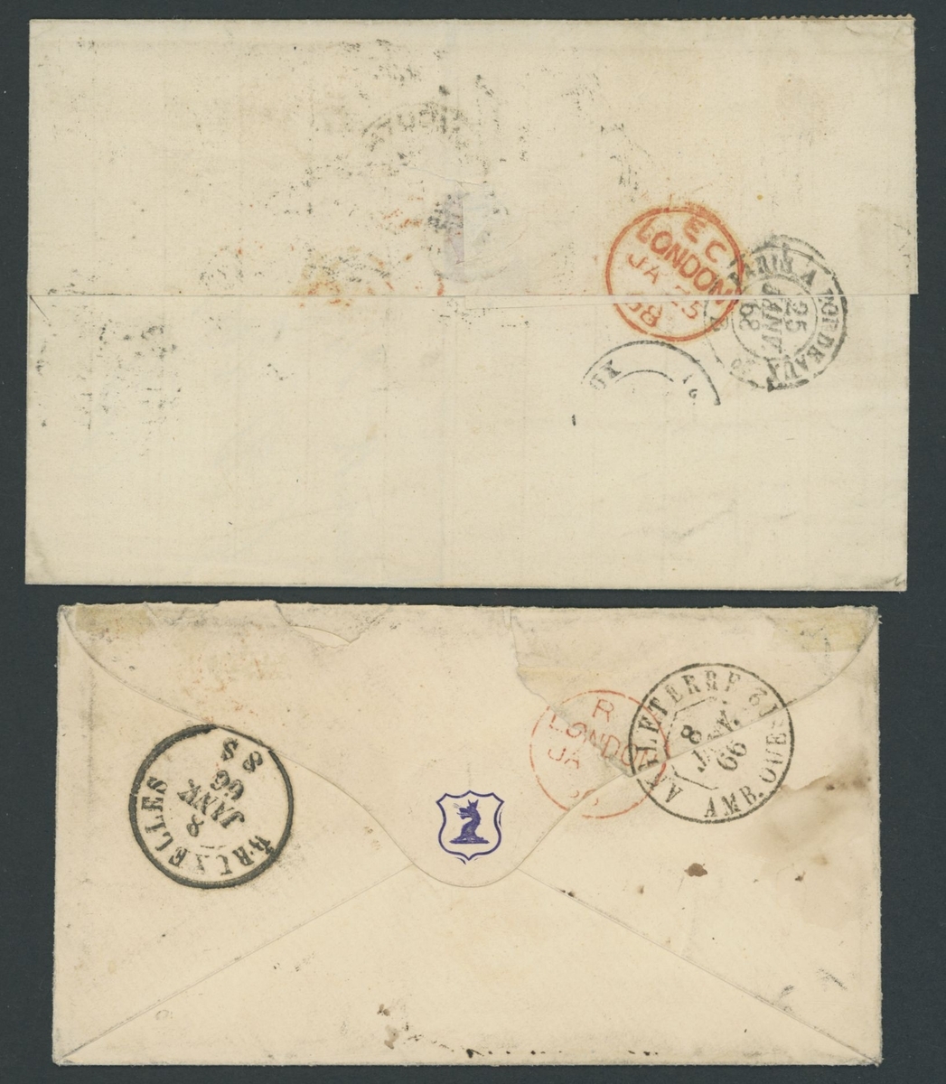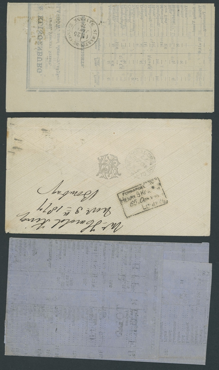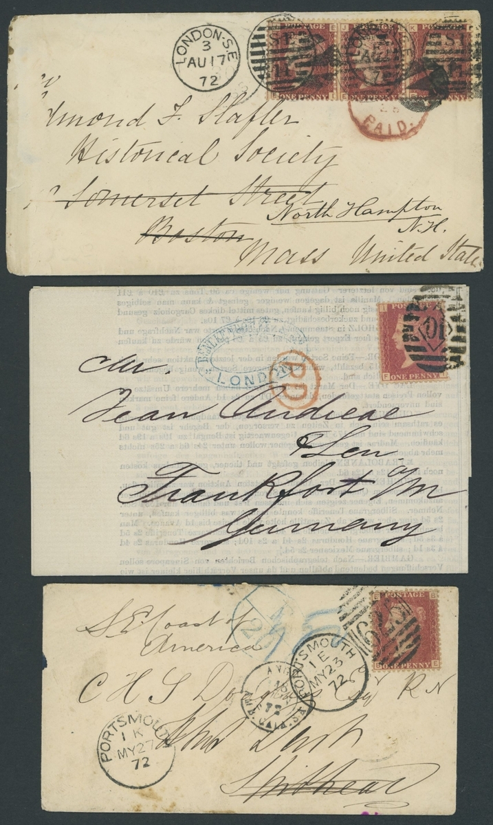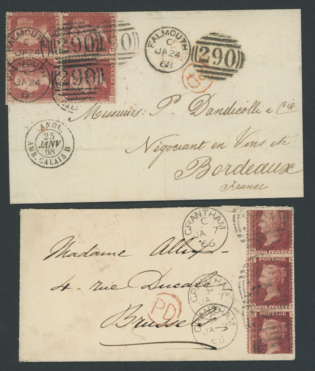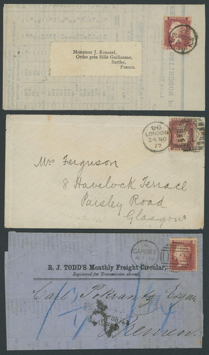 Selection on seven envelopes or entires to overseas destinations,  including Plate 80 vertical strip of three with the perfs. trimmed at top and foot to fit the envelope addressed to Belgium, Plate 81 block of four on entire to France, Plate 93 on prices current to Germany with