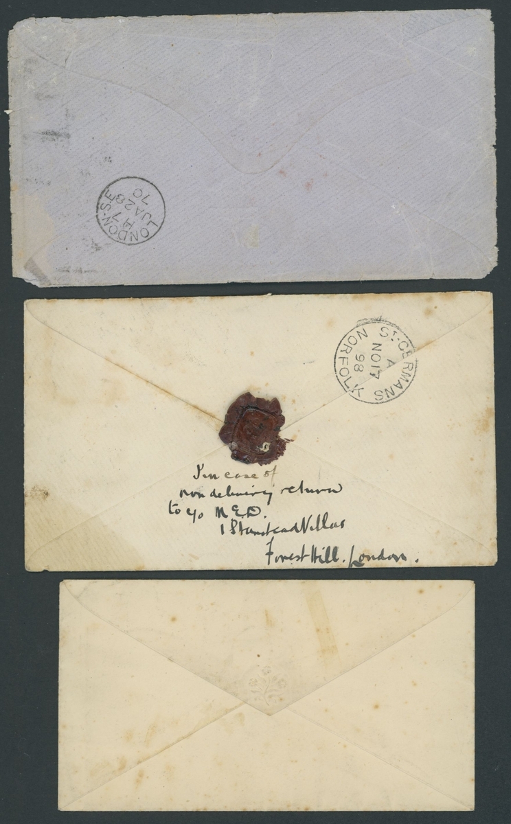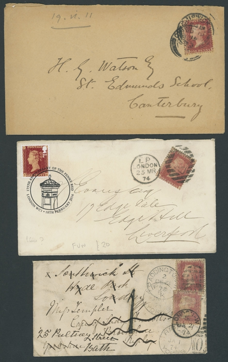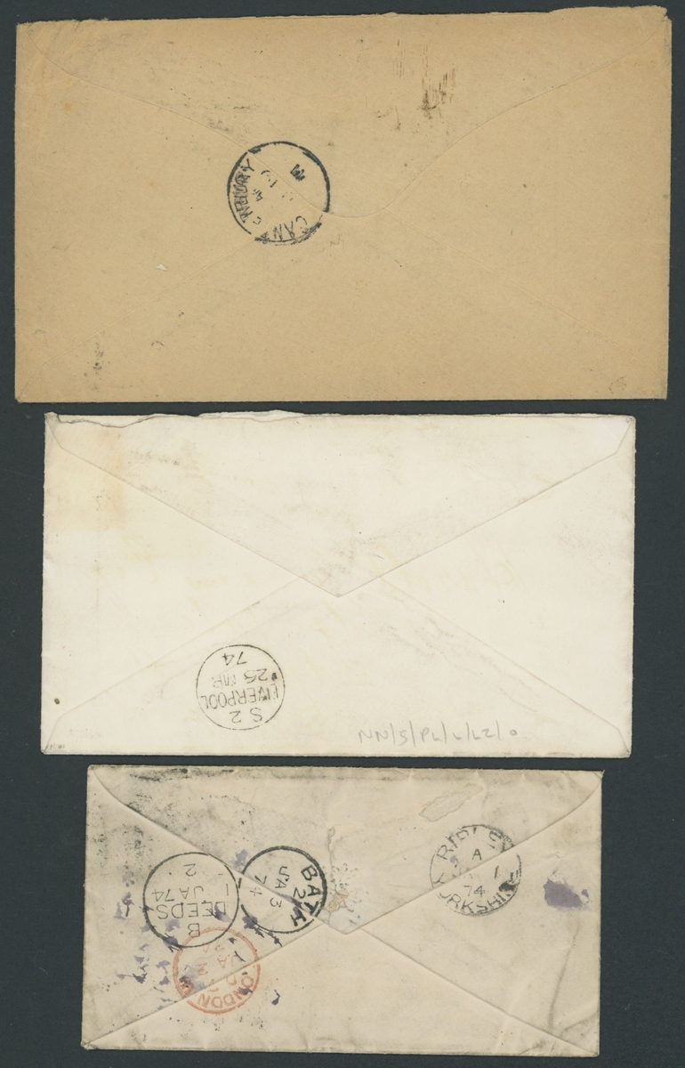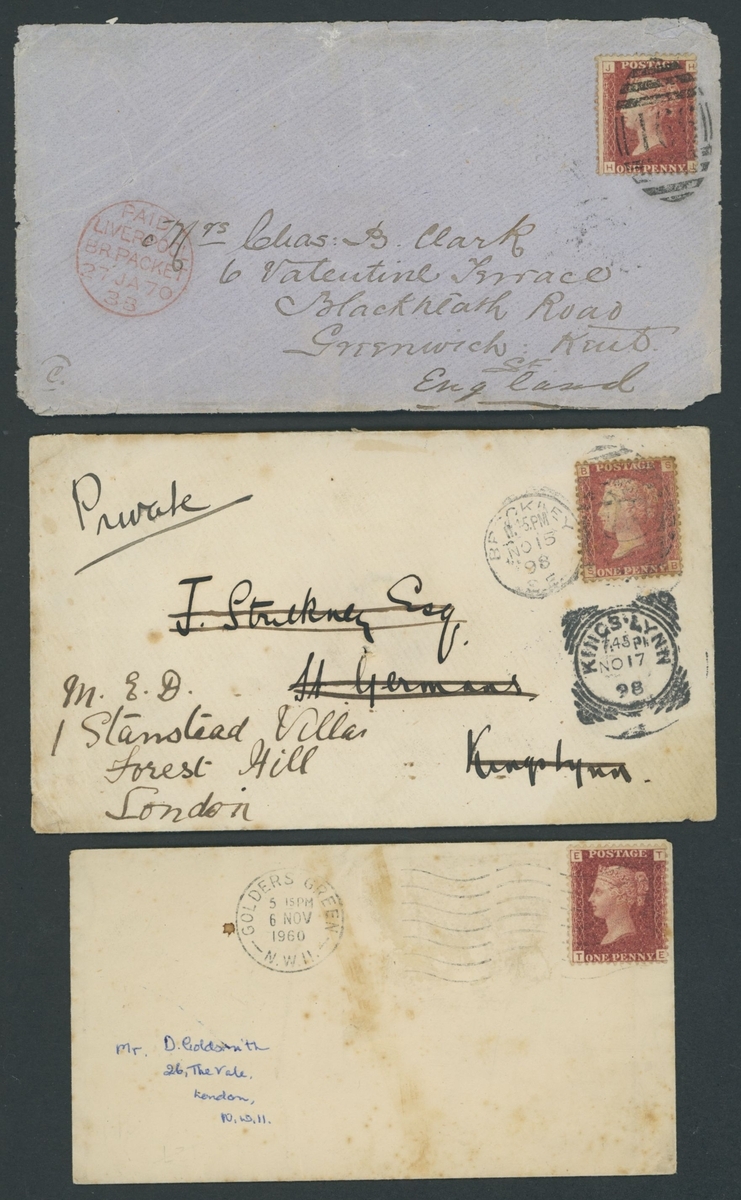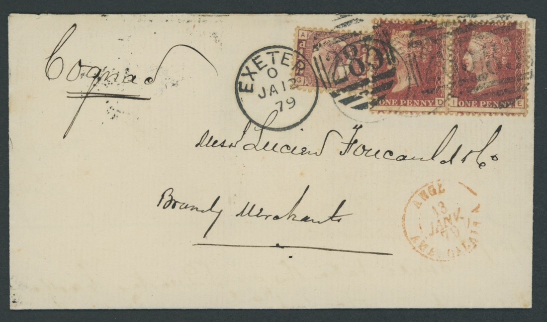Selection of eleven items, including Plate 90 with "A18" cancellation of Antigua, Plate 98  on 1893 envelope to Kings Lynn, re-directed to London, Plate 117 on 1960 envelope from Golders Green, Plate 144 with "610" (Scilly Islands) barred oval, Plate 151 and 163 on envelope three times re-directed, Plate 195 pair with ½d. Plate 14 on Wine Merchants entire with engraving of a bunch of grapes on the interior, to Cognac, etc.,  good to fine