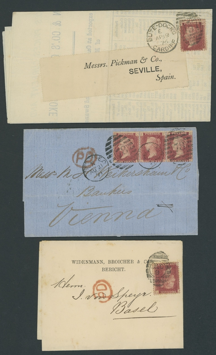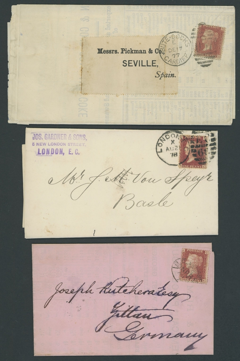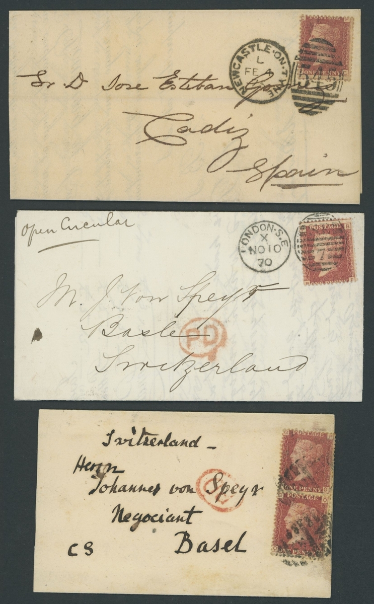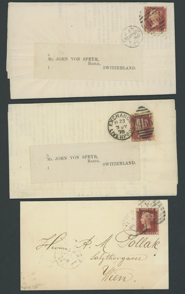 Selection of thirty entires, wrappers or envelopes addressed overseas,  destinations including Austria, France, Germany, Italy, Netherlands, Spain, Sweden, Switzerland, etc., mostly single 1d. frankings but some multiples; chiefly good to fine