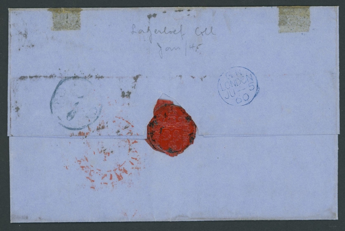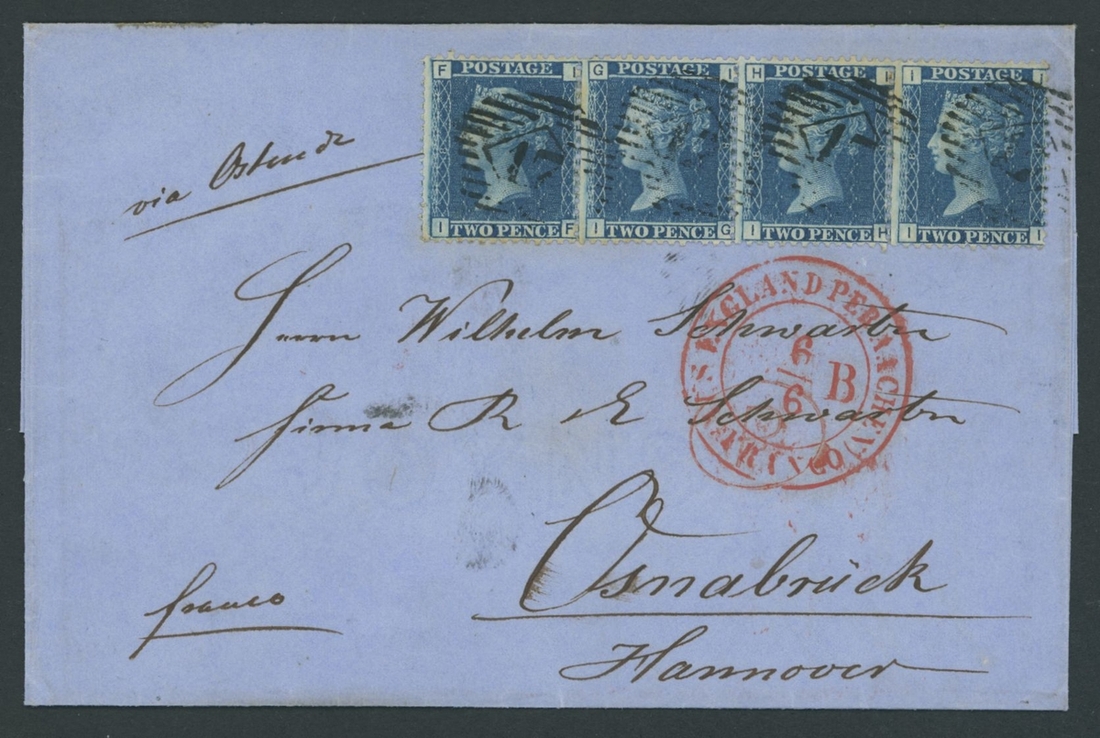 Plate 8: IF-II horizontal strip of four, tied by London Inland "17" numeral cancellations  to entire addressed to Hannover, endorsed Via Ostende, red