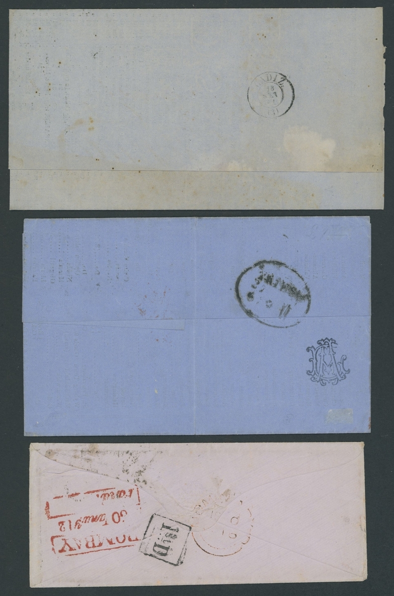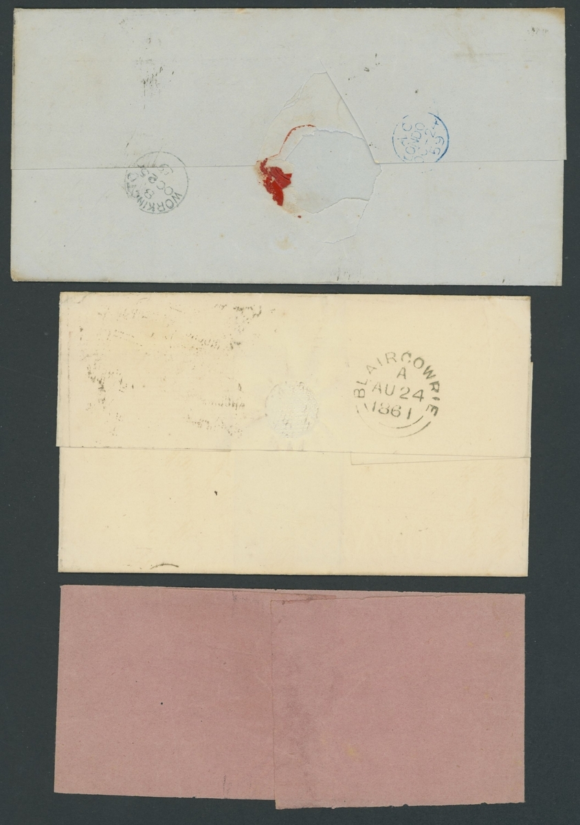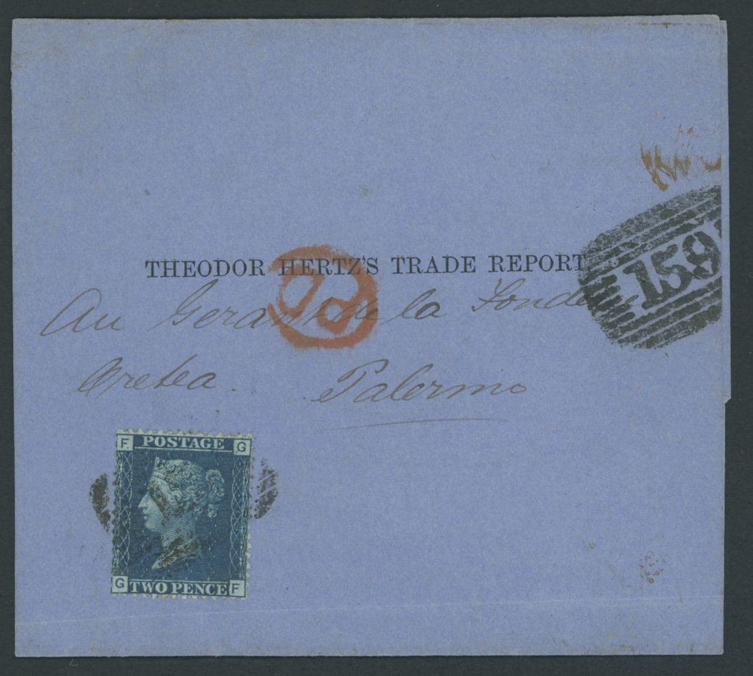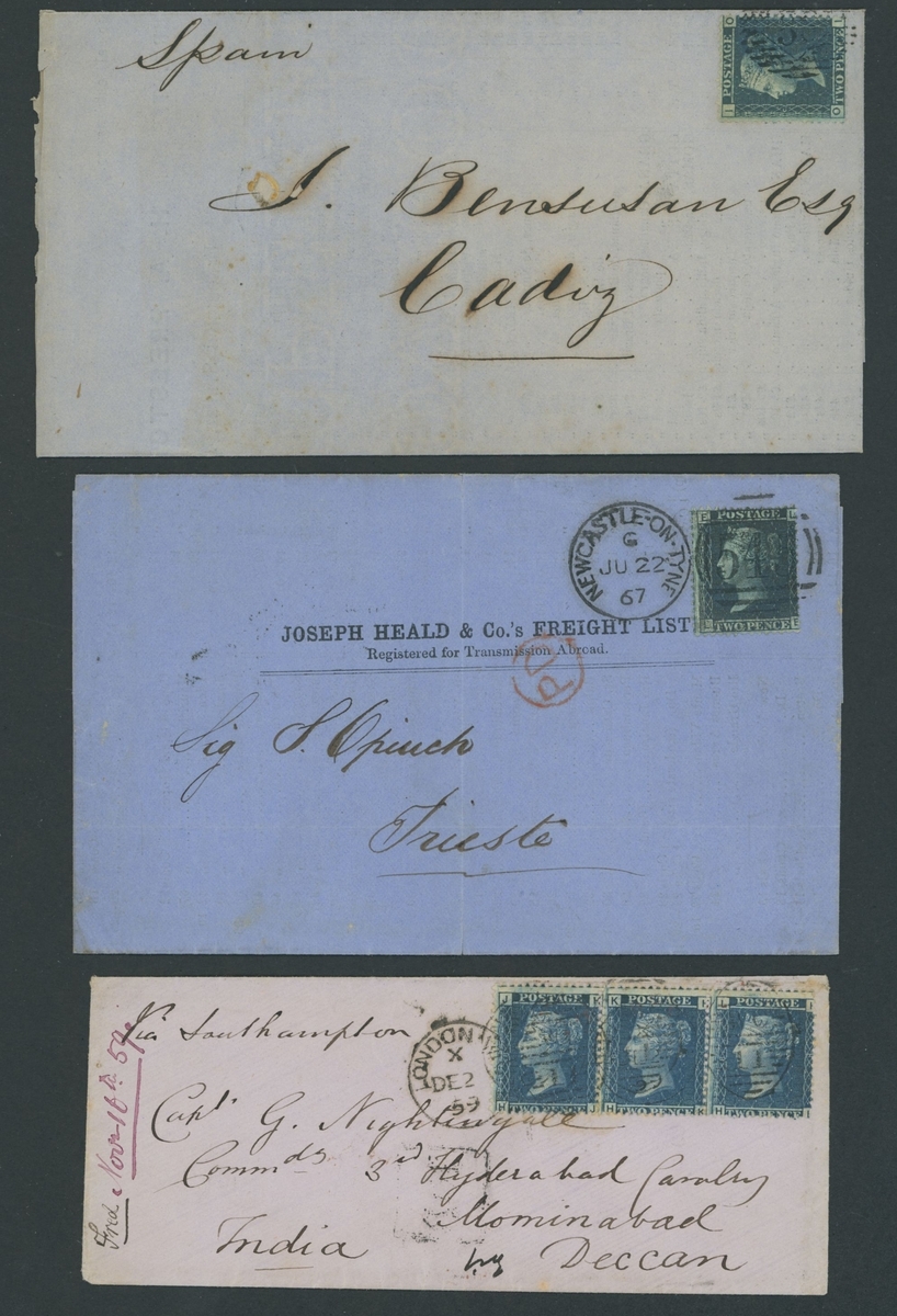 Selection of sixteen, including Plate 8 on pink wrapper to Piemont,  strip of three on envelope addressed to 3rd. Hyderabad Cavalry In India, Plate 13 block of six (2 x 3), Plate 13 on wrapper from Glasgow to Palermo, etc., good to fine