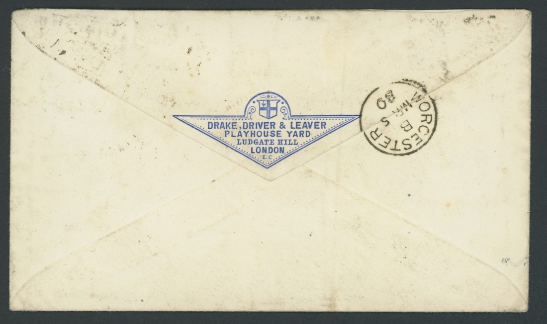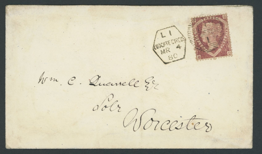 Plate 3: BD, tied by hexagonal Ludgate Circus duplex cancellation of 4 March 1880  to advertising envelope (Drake, Driver & Leaver, printers, stationers and lithographers) addressed to Worcester; fine. S.G. 51/52