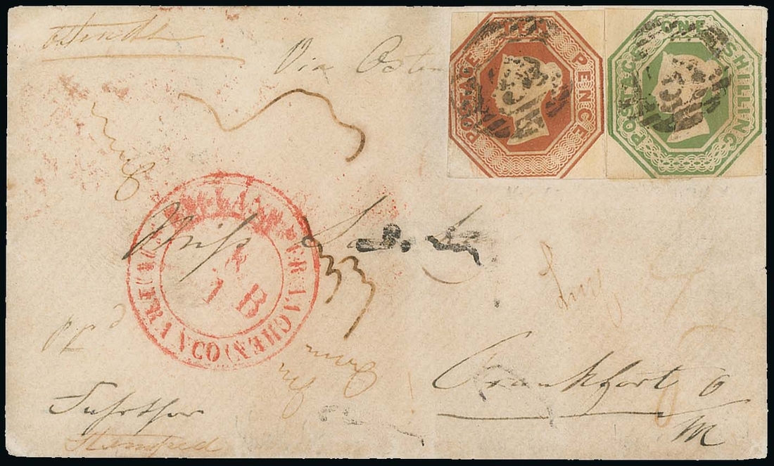 1/- and 10d., both cut square but touched or a little cut into at places,  on envelope to Frankfurt, via Ostende, "498" barred oval cancellations of Manchester; transit and arrival markings, some minor imperfections but an attractive and scarce combination