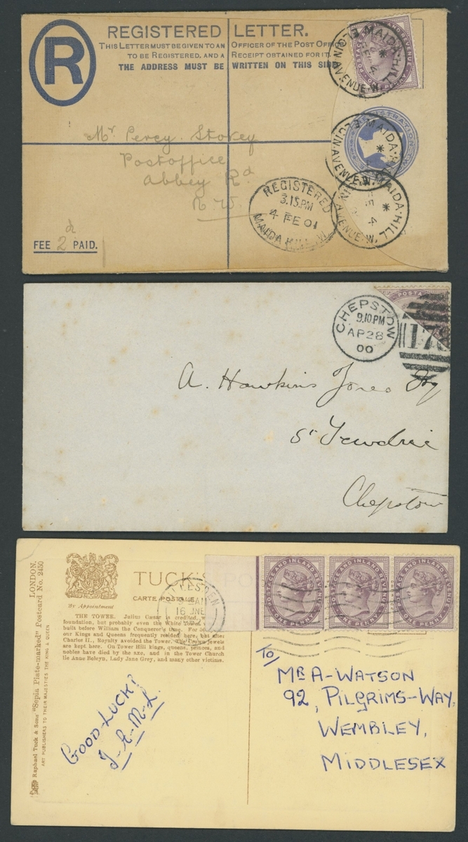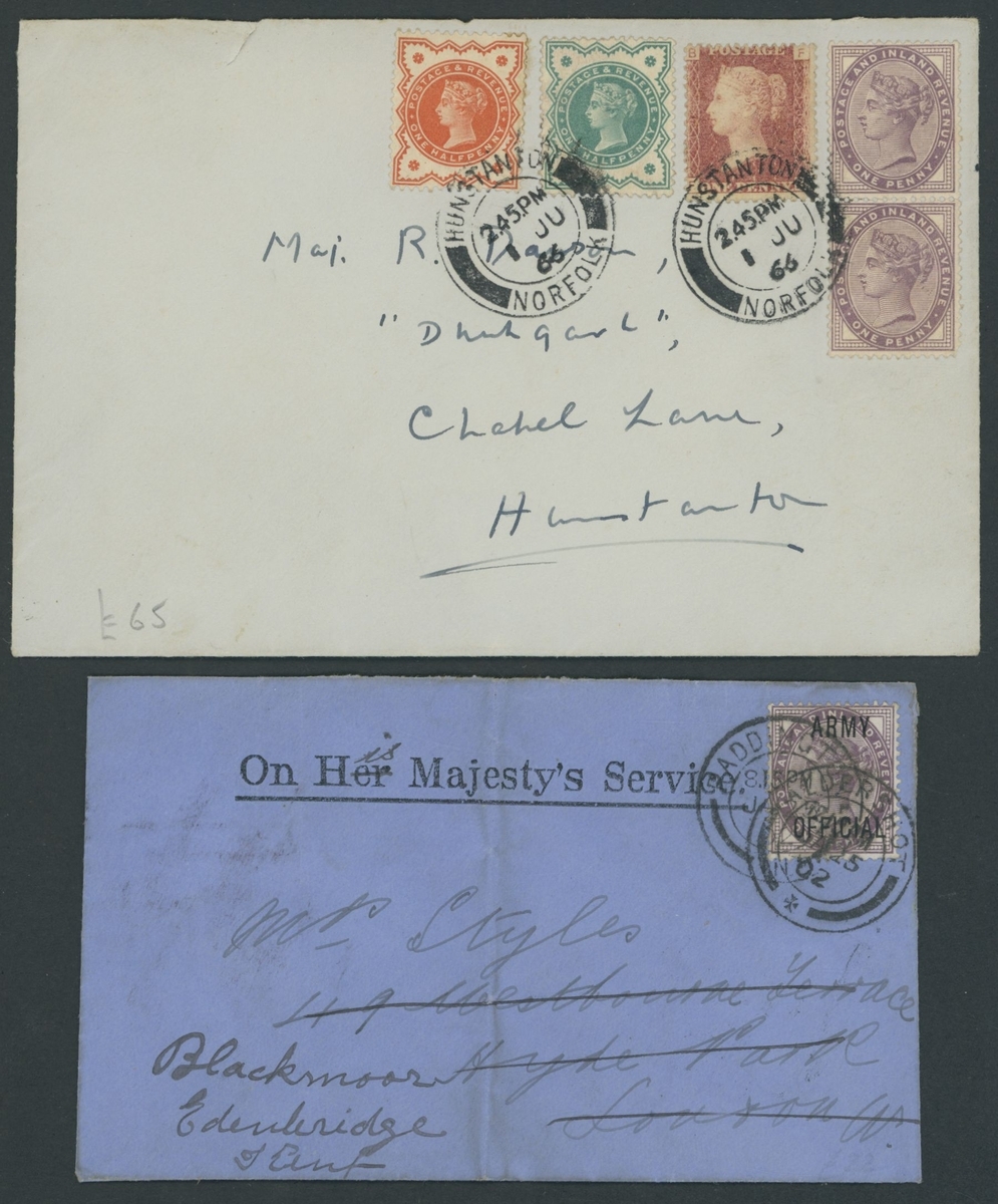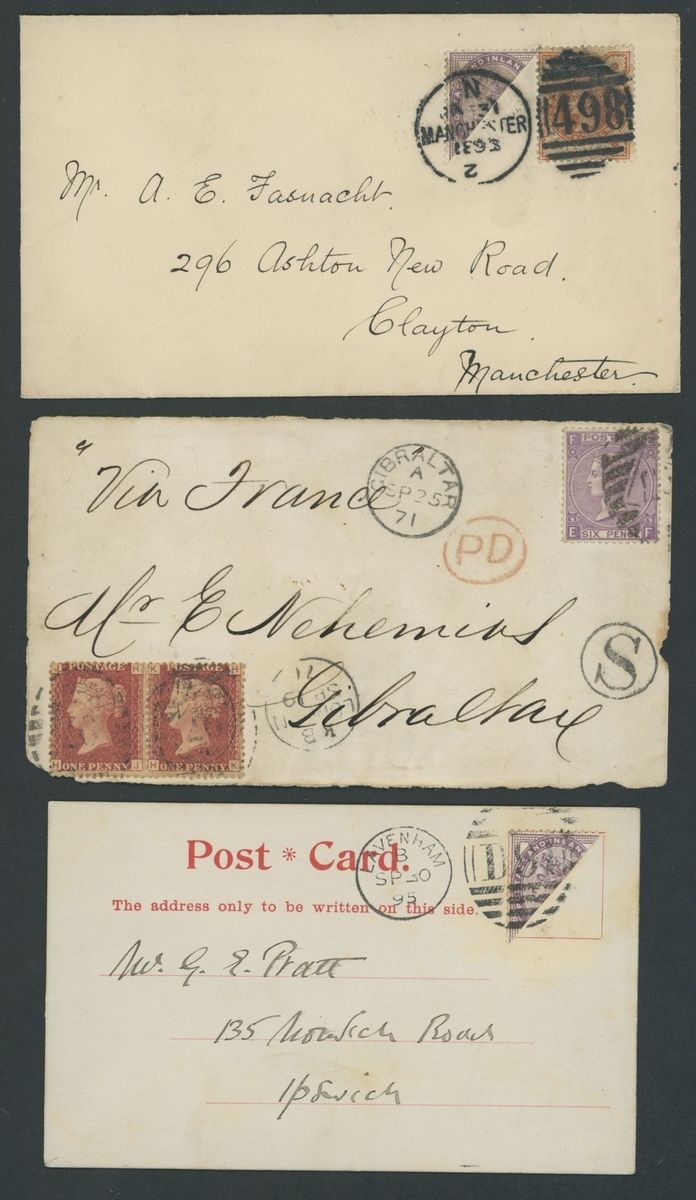 Selection of ten items, including 1871 front to Gibraltar franked 1d. Plate 117 pair and 1867-80 6d. Plate 9,  1871 1d. imperf. imprimatur, 1d. bisect (3 on cover or card), strip of three on 1966 p.p.c., Army Official 1d. on 1902 O.H.M.S. envelope; good to fine