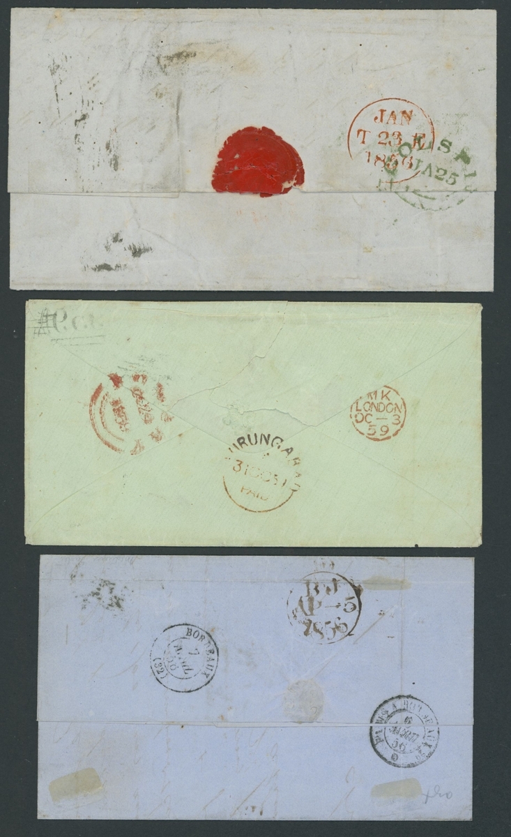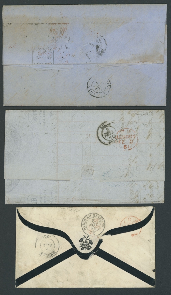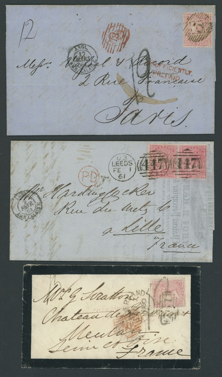 4d., Selection of six entire letters/envelopes, including watermark small Garter on entire letter from Edinburgh to Golspie,  watermark medium Garter, glazed paper on entire from London to Bordeaux, watermark large Garter (3) on envelope from Clifton to India, pair on entire letter from Leeds to Lille with fine engraving on the interior, 1861 entire from London to Paris with red PD cancelled by "43" barred numeral, etc., good to fine