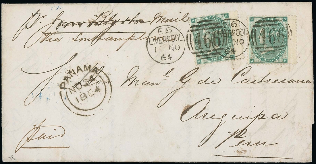 1/- green, Plate I (2, both wing-margin examples lettered RH and QH),  on 1864 entire to Arequipa, Peru, Via Southampton, tied by superb strikes of