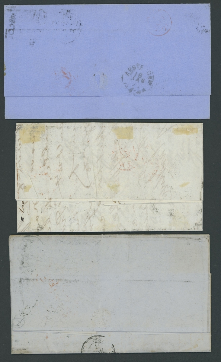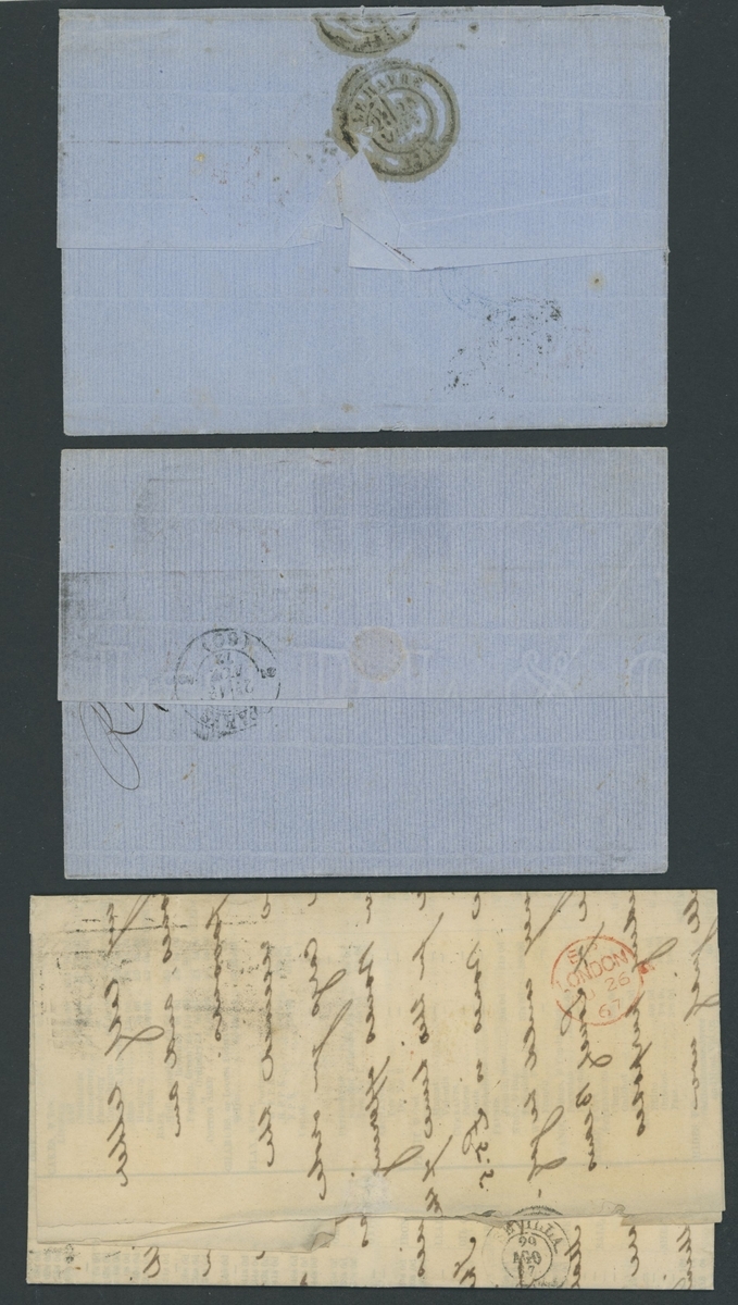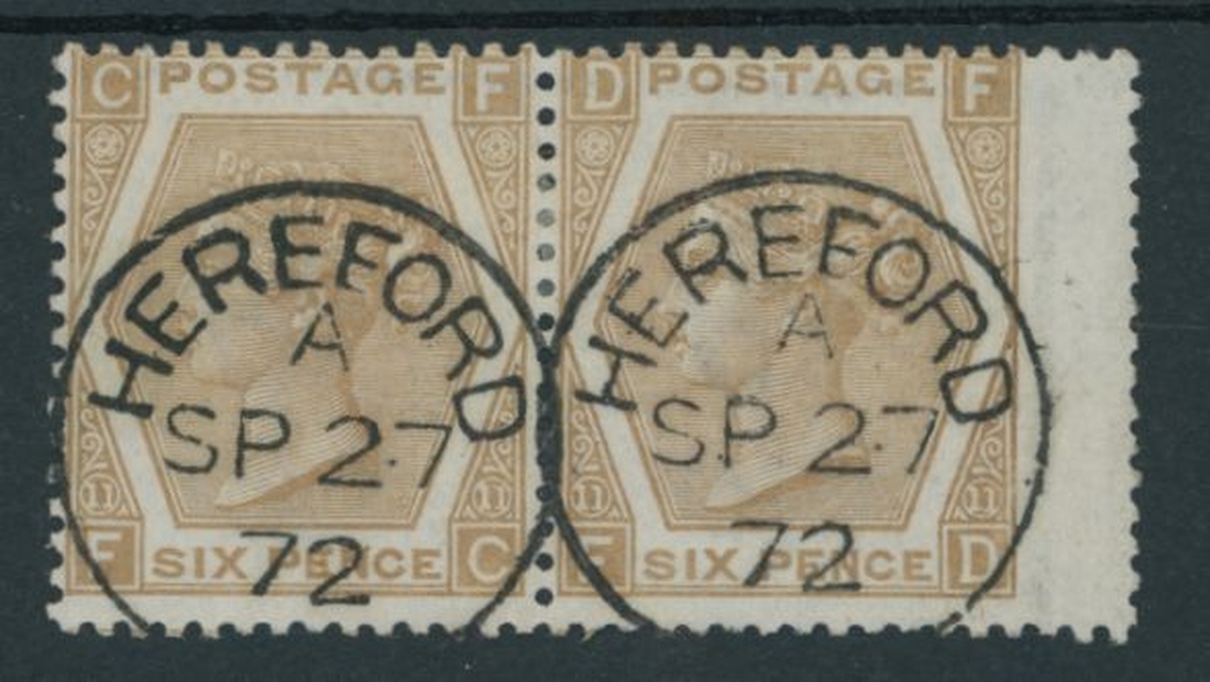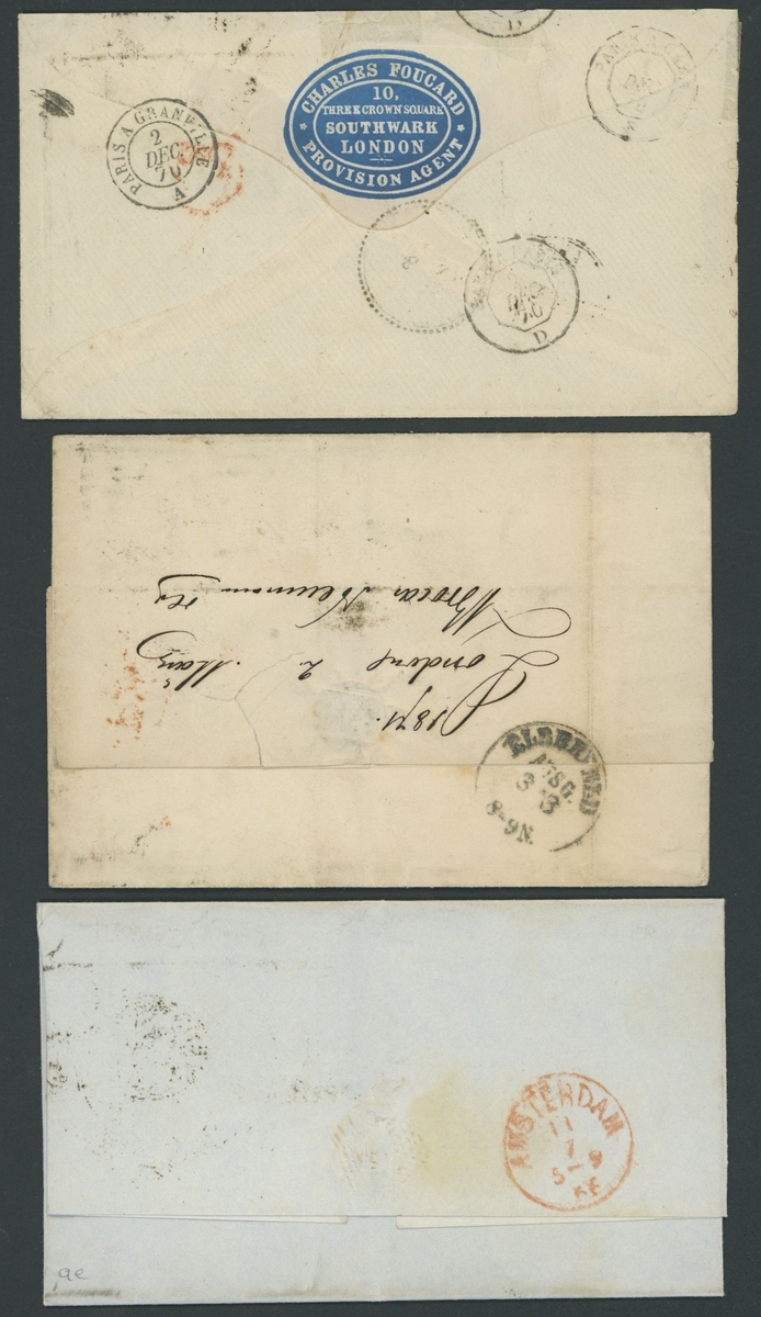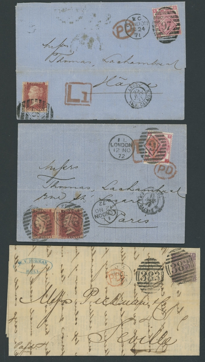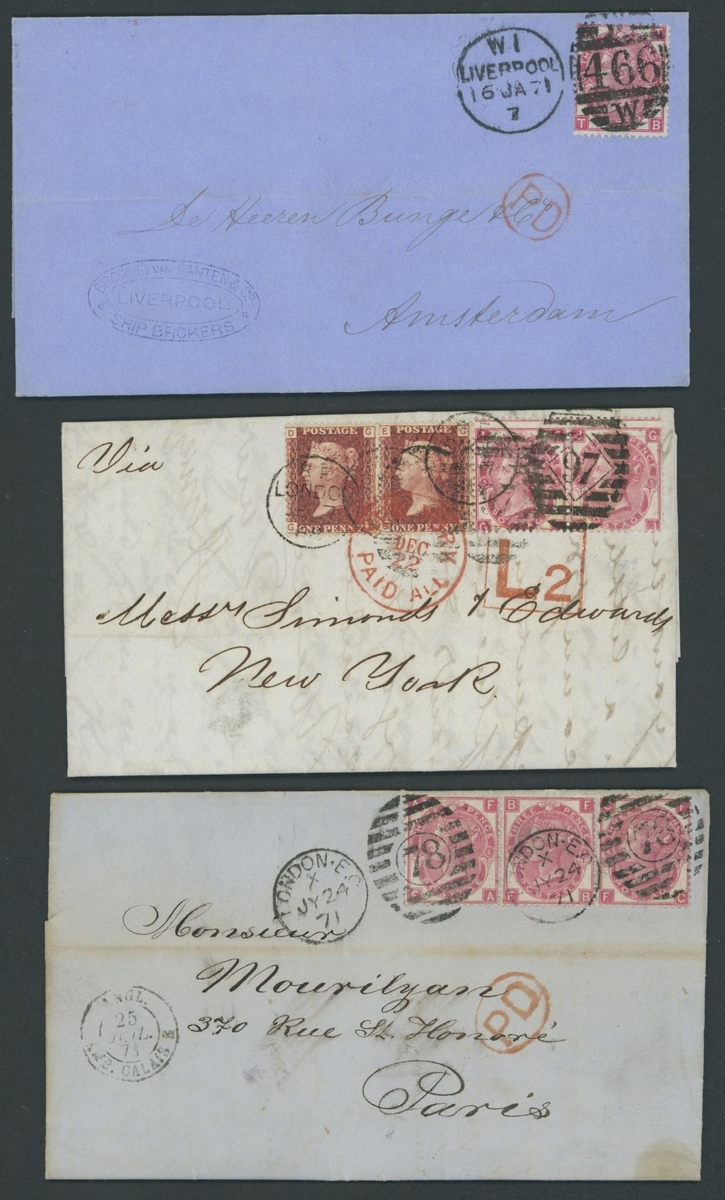 Watermark Emblems: 3d. rose, Plate 4, tied by London "84" duplex to entire letter to Amsterdam,  1867-80 watermark Spray 3d. Plate 5 on entire to Amsterdam and another on envelope to Calvados, another cut out from a different entire and re-used to Germany, pair used with 1d. Plate 108 pair on entire to New York, Plate 6 single with 1d. Plate 147 on entire to France, strip of three on entire to Paris, Plate 9 with 1d. Plates 154 and 158 on entire to Paris, 6d. Plate 6 on entire to Seville, also 1872-73 6d. pale buff wing margin pair (off cover) with superb upright Hereford c.d.s's; good to fine