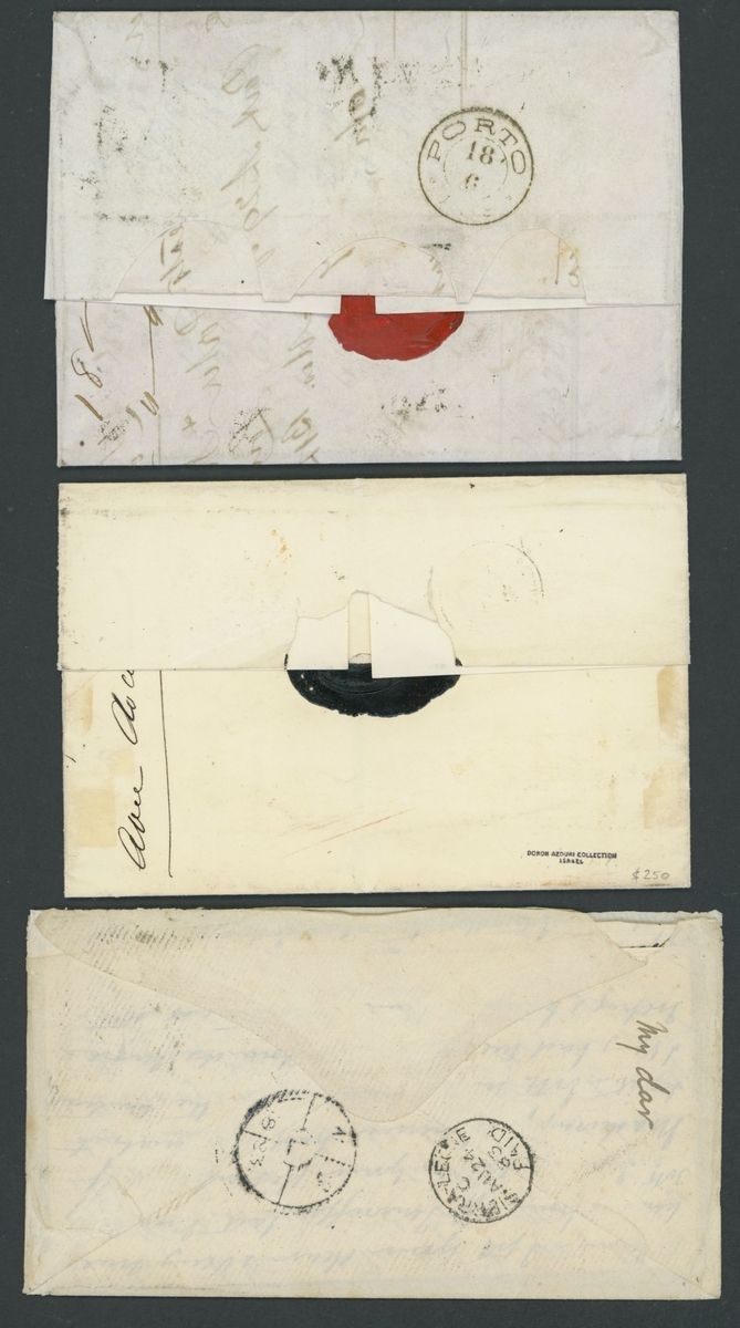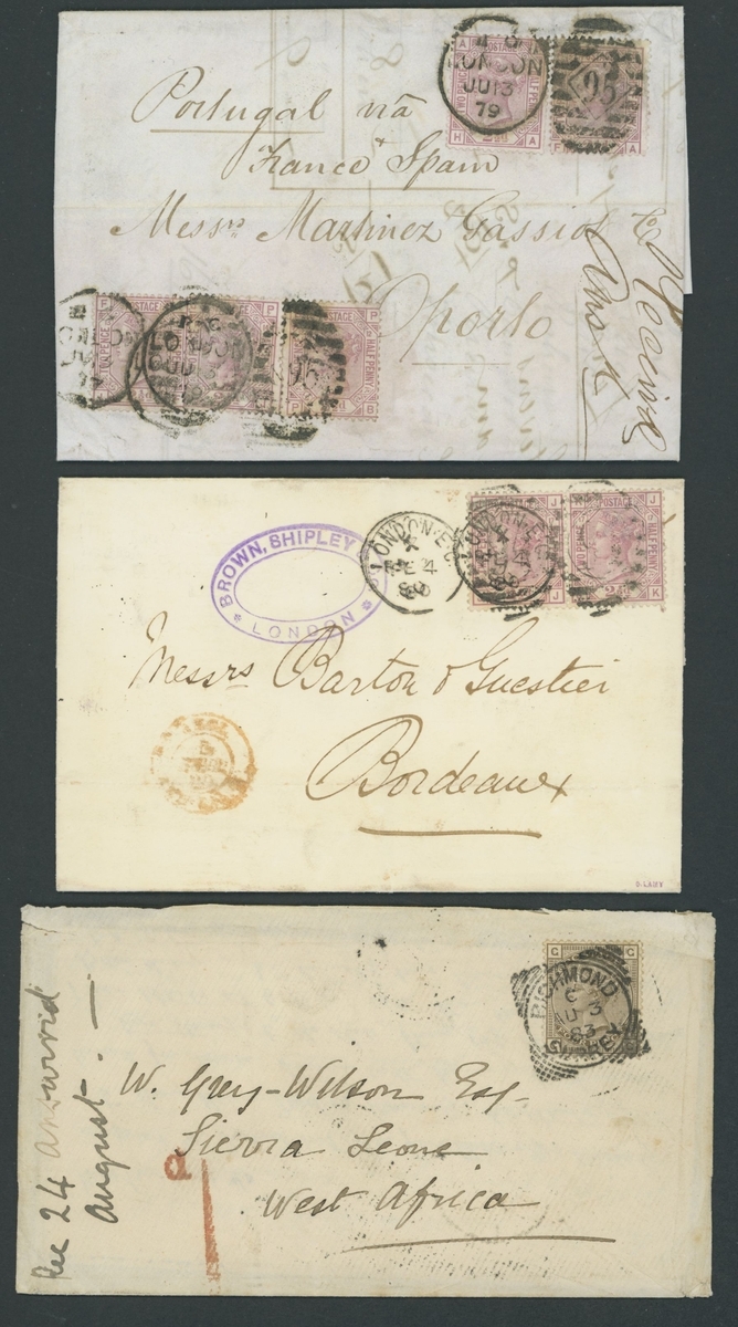 2½d. rosy mauve, Plate 12, Plate 13 (3) and Plate 14 to make to 1/- ½d. rate on entire to Porto, London "95" duplex cancellations of 13 June 1879 and arrival (18.6) on reverse; filing fold clear of the adhesives. A most unusual entire showing three different Plates.; Plate 17, JJ-JK, tied by London duplex to 4 Feb. 1880 entire to Bordeaux. Also 1880-83 4d. grey-brown, Plate 18 tied by Richmond/Surrey squared circled 03.08.83 d.s. to envelope addressed to Sierra Leone. A scarce trio.