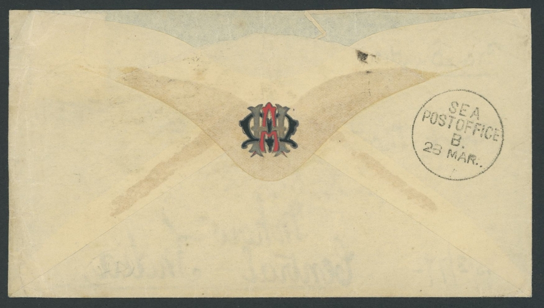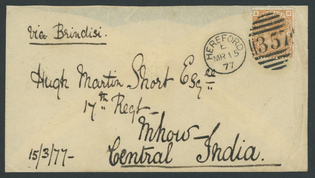8d. orange, tied by "357" Hereford duplex cancellation of 15 March 1877 to envelope  (flap missing) to Central India, Sea Post Office arrival datestamp (28.3) on reverse; a little wrinkled, fine. S.G. 156