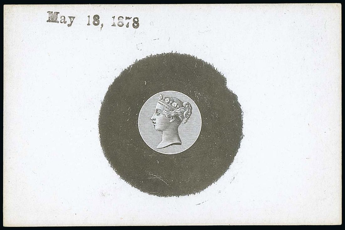 1878 die proof of the Queen's head on uncleared surround, dated 'May 18 1878' on white glazed card,  fine and rare.