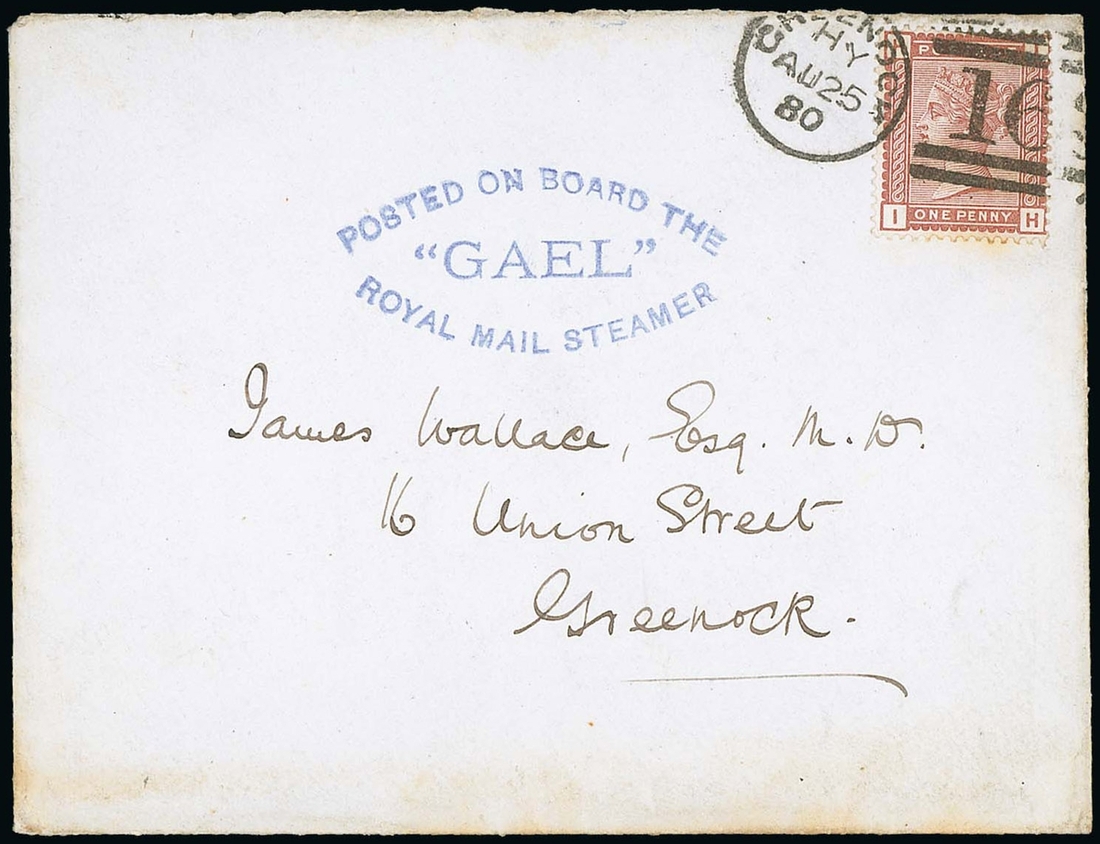 1d. Venetian red, tied by Greenock '163 duplex to 1880 (25 Aug.) envelope, possibly from Islay bearing blue cachet "