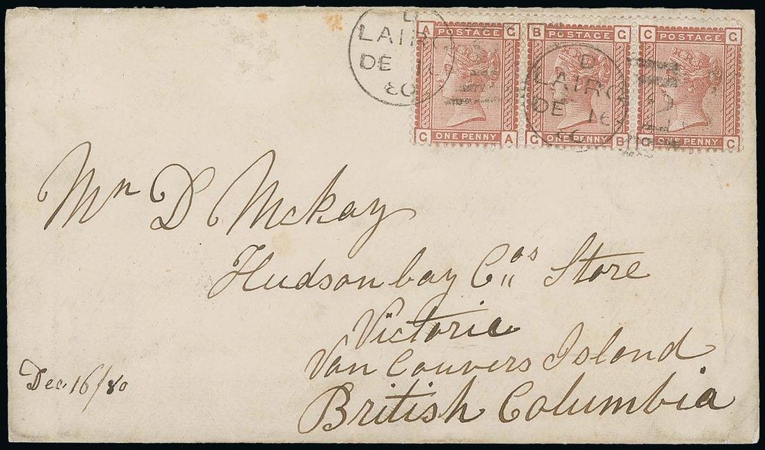 1d. Venetian red strip of three, tied by Lairg '237' duplex to 1880 (16 Dec.) envelope to "Hudson Bay Cos Store, Van Couvers Island, British Colombia", the reverse with Windsor and Victoria d.s.  Scarce, the cover would have travelled by train from Windsor, Ontario with the Hudson Bay Company store receiving mail for collection.