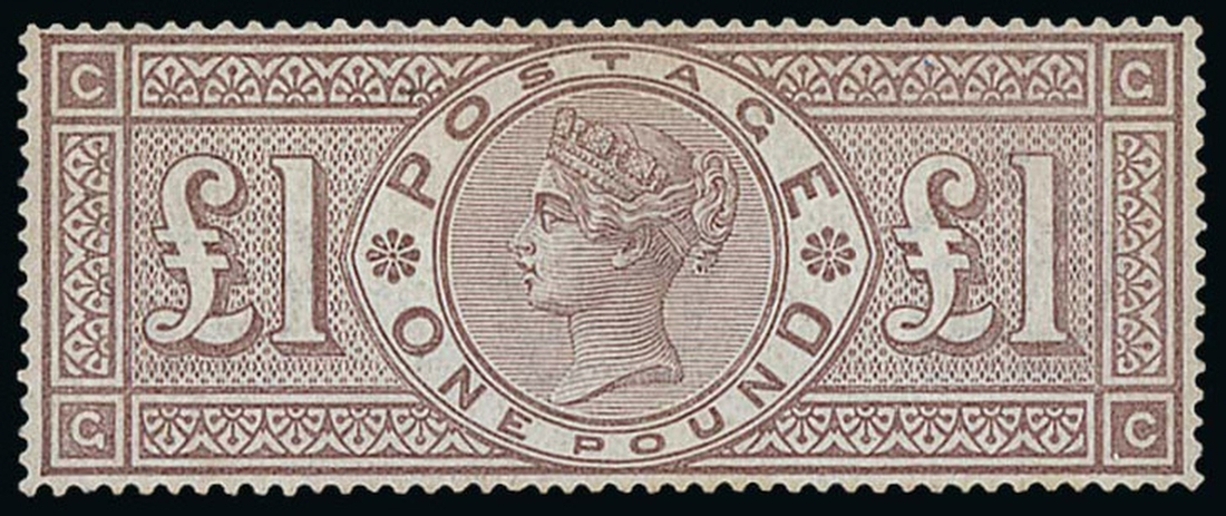 £1 brown-lilac, GC, in an unusually pale colour, large part original gum;  there is a light vertical gum bend at left and gum wrinkle. Well centred, a desirable example of this difficult stamp. Diena Certificate (1950) and signed on the reverse. S.G. 185, £28,000. Photo