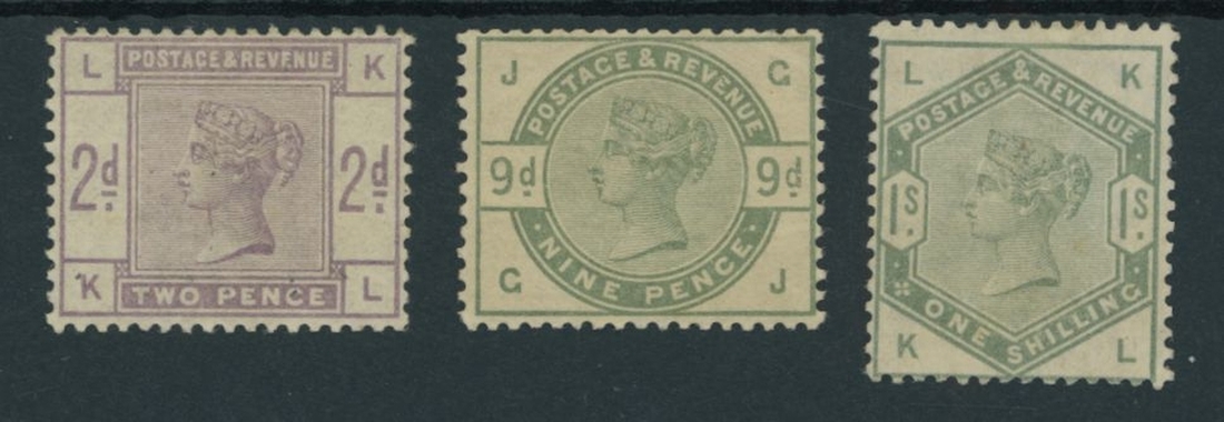 2d. lilac, 9d. and 1/- dull green, all part to large part original gum, typically brown and crackled; generally good though the 9d. and 1/- with minor bends. S.G. 189, 195 and 196,  £3,080