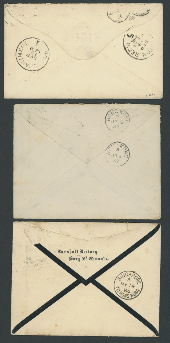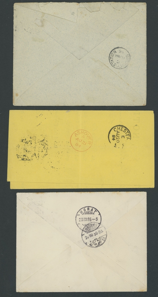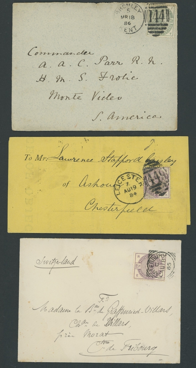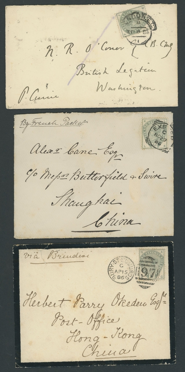 Small selection of six covers, including 3d. on yellow Notice of Objection wrapper, 4d. on cover from Bromley to Montevideo, 5d. on mourning cover from Bury St. Edmunds to Hong Kong, another from Exeter to Shanghai and another on envelope from London to Washington, also 5d. off cover;  good to fine