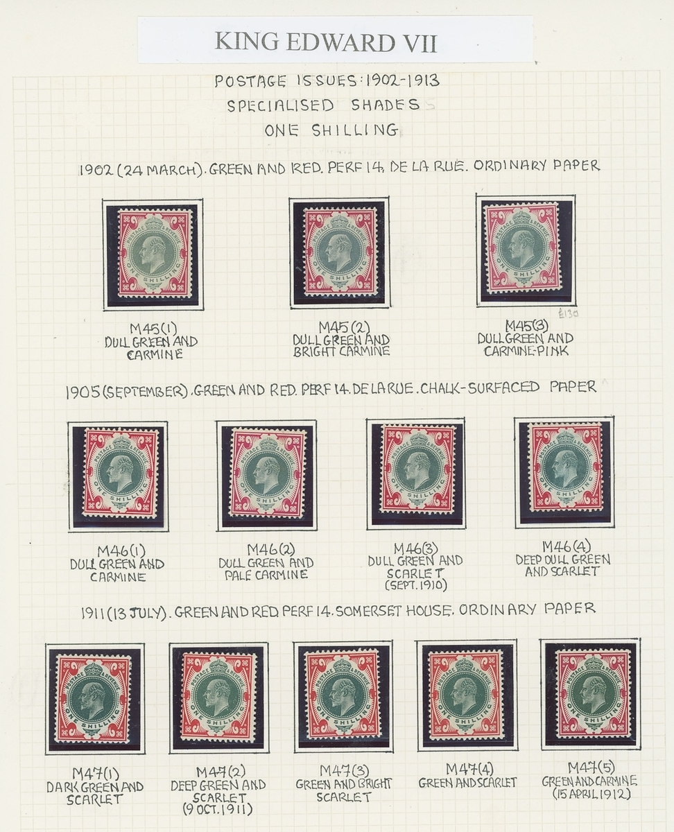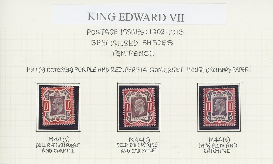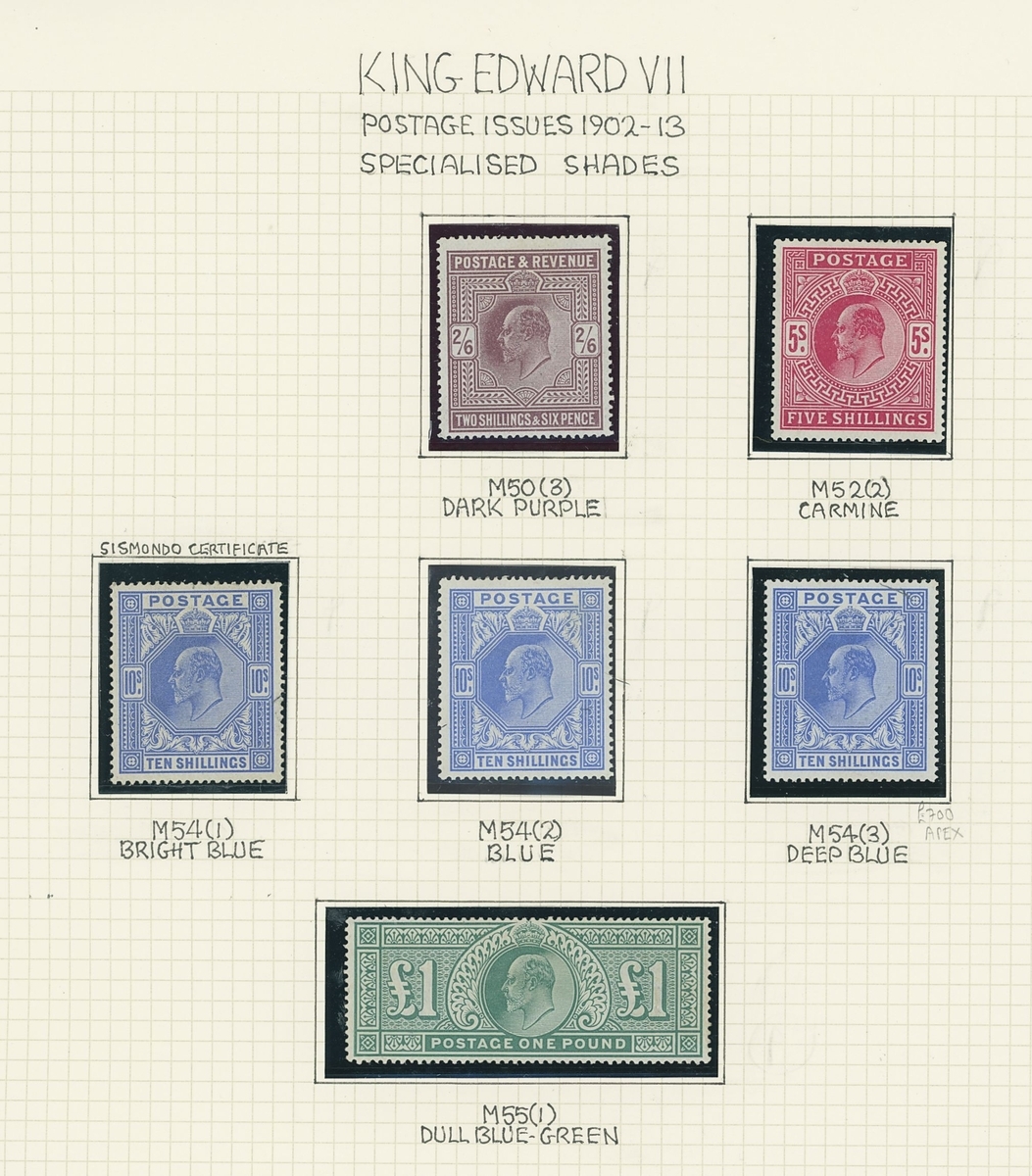 1902-11 mint specialised collection of the different shades arranged in a Frank Godden album with custom made pages, neatly written up and including ½d. 1902 (2), 1904 (2), 1911 perf. 14 (7) and 1911 perf. 15 x 14, 1d. 1902 (3), 1911 (7) and 1913 (5), 1½d. 1902 (2), 1905 (2) and 1911 (7), 2d. 1902 (3), 1906 (3) and 1911 (2), 2½d. 1902 (3), 1911 perf. 14 (3) and perf. 15 x 14, 3d. 1902 (2), 1906 (4), 1911 perf. 14 (3) and 15 x 14 (3), 4d. 1902 (2), 1906 (2), 1909 (2) and 1911 (2), 5d. 1901 (2), 1906 (2) and 1911 (3), 6d. 1902 (2), 1906 (3), 1911 (7), 1912 (3) and 1913 perf. 14 (2, coated or chalk-surfaced paper), 7d. 1912, 9d. 1902 (3), 1905 (4) and 1911 (3), the slate-purple with R.P.S certificate (2014), 10d. 1902, 1906 (4, incl. very rare slate-purple and deep (glossy) carmine, light horizontal crease, only visible from rear and with Hendon certificate (2008) and 1911 (8), 1/- 1902 (3), 1905 (4) and 1911 (5), 1911 2/6d. dark purple, 1912 5/- carmine, 1912 10/- (all three shades, one with Sismondo certificate (2007) noting gum bends) and 1902-11 £1. Slightly mixed condition but the majority are very fine, high catalogue value,  an enjoyable collection with room for expansion.