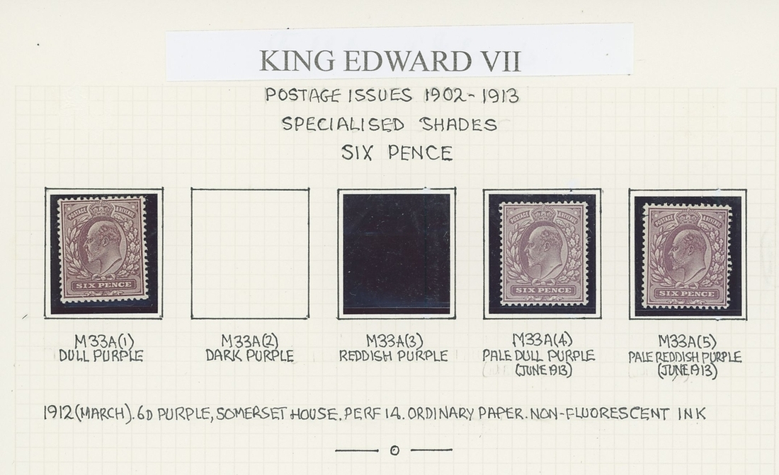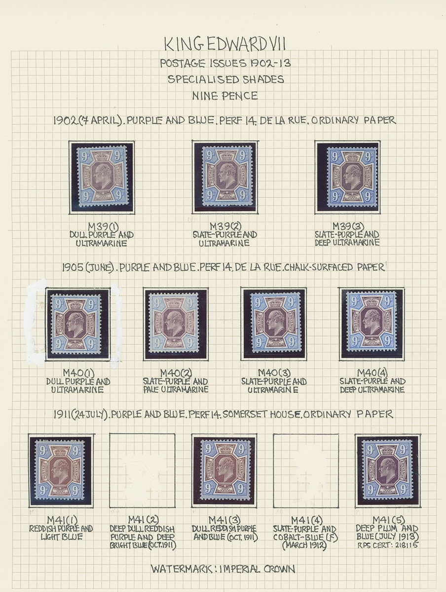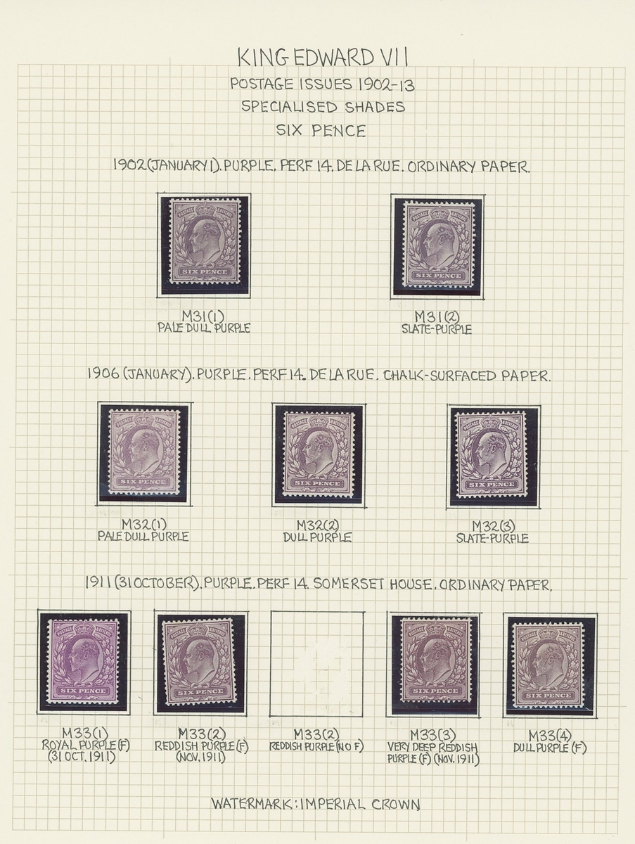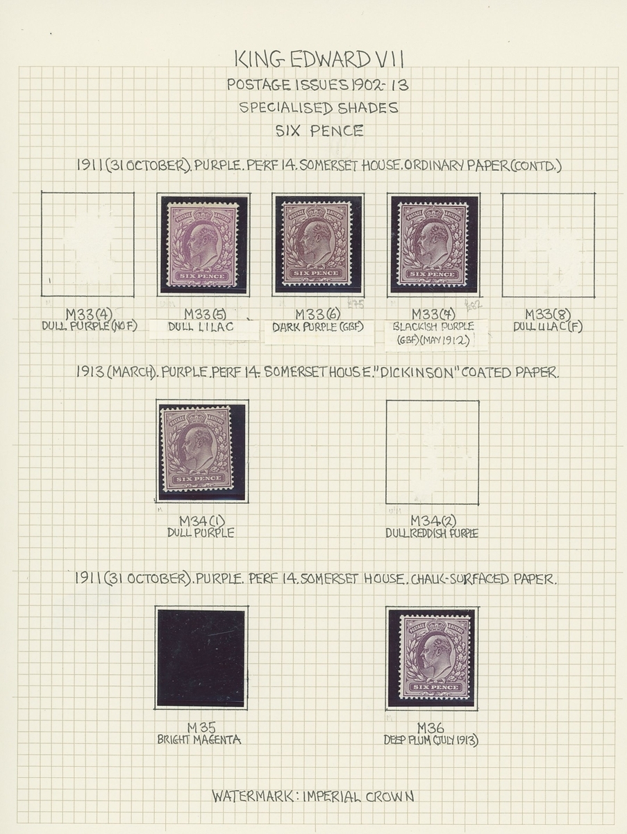 1902-11 mint specialised collection of the different shades arranged in a Frank Godden album with custom made pages, neatly written up and including ½d. 1902 (2), 1904 (2), 1911 perf. 14 (7) and 1911 perf. 15 x 14, 1d. 1902 (3), 1911 (7) and 1913 (5), 1½d. 1902 (2), 1905 (2) and 1911 (7), 2d. 1902 (3), 1906 (3) and 1911 (2), 2½d. 1902 (3), 1911 perf. 14 (3) and perf. 15 x 14, 3d. 1902 (2), 1906 (4), 1911 perf. 14 (3) and 15 x 14 (3), 4d. 1902 (2), 1906 (2), 1909 (2) and 1911 (2), 5d. 1901 (2), 1906 (2) and 1911 (3), 6d. 1902 (2), 1906 (3), 1911 (7), 1912 (3) and 1913 perf. 14 (2, coated or chalk-surfaced paper), 7d. 1912, 9d. 1902 (3), 1905 (4) and 1911 (3), the slate-purple with R.P.S certificate (2014), 10d. 1902, 1906 (4, incl. very rare slate-purple and deep (glossy) carmine, light horizontal crease, only visible from rear and with Hendon certificate (2008) and 1911 (8), 1/- 1902 (3), 1905 (4) and 1911 (5), 1911 2/6d. dark purple, 1912 5/- carmine, 1912 10/- (all three shades, one with Sismondo certificate (2007) noting gum bends) and 1902-11 £1. Slightly mixed condition but the majority are very fine, high catalogue value,  an enjoyable collection with room for expansion.