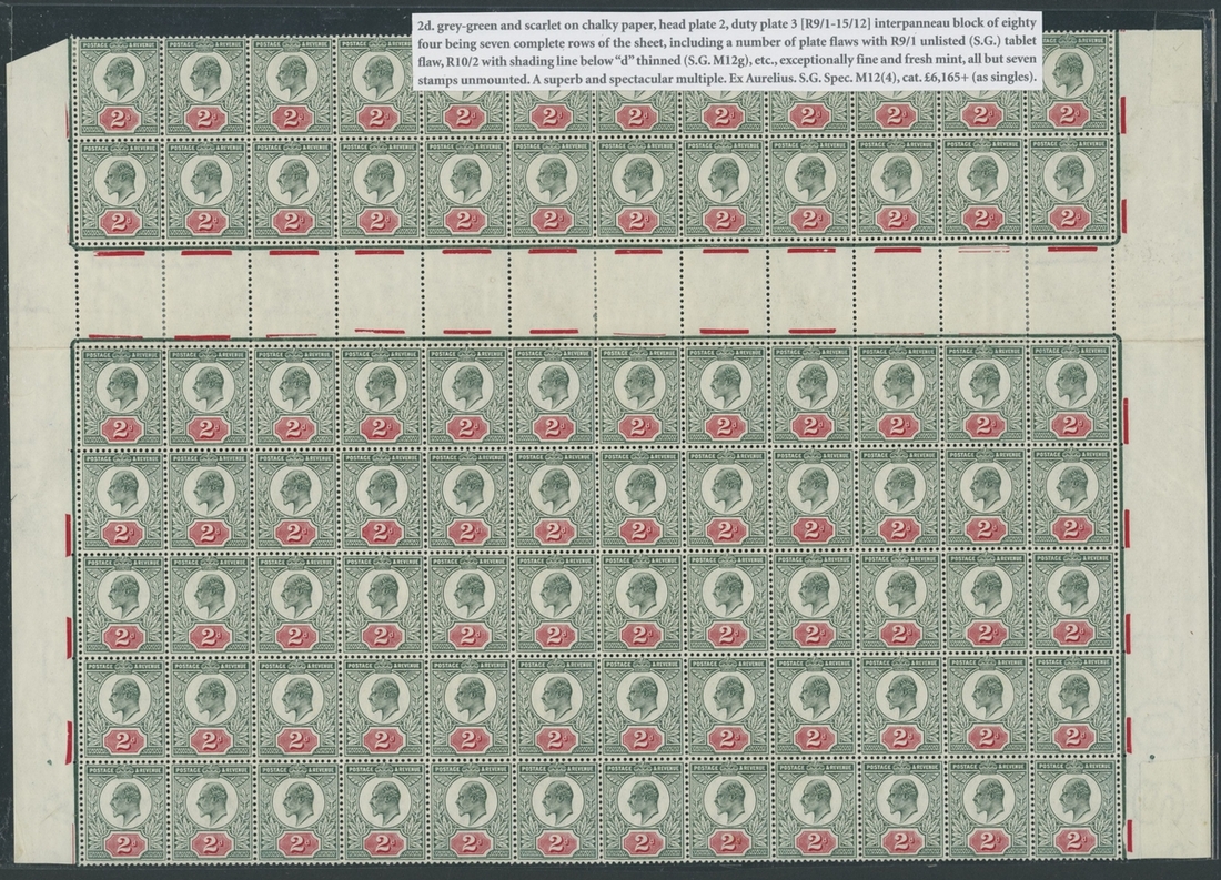 2d. grey-green and scarlet on chalky paper block of eighty-four (12x7) [R9/1-R15/12] with interpanneau margin beneath upper two rows, from hear plate 2, duty plate 3; another of small plate flaws including R9/1 unlisted tablet flaw, R10/2 shading below "d" thinned.  Unmounted except just seven stamps, single horizontal fold along perforations otherwise very fine and fresh. Spec. M12(4),  £6,475+
