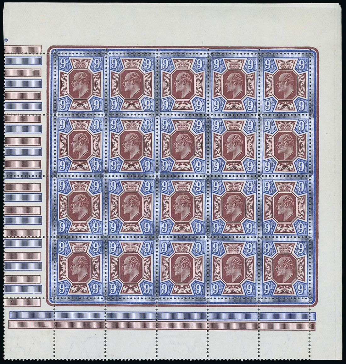 9d. deep dull reddish purple and deep bright blue complete pane of twenty (5x4) from head plate 2a, die plate 1 showing crack in duty plate rule above R1/4; unmounted except single stamp, diagonal gum bends affecting five stamps, otherwise fine and a beautiful example of this shade. S.G. 306a, Spec. M41(2),  £3,895+