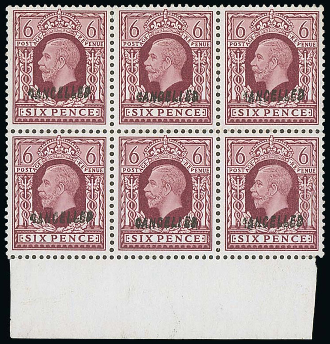 The essay for the unissued 6d. value, a block of six (3x2) from the foot of the sheet in purple on gummed, watermark block cypher paper, perforated 15x14, each stamp handstamped "