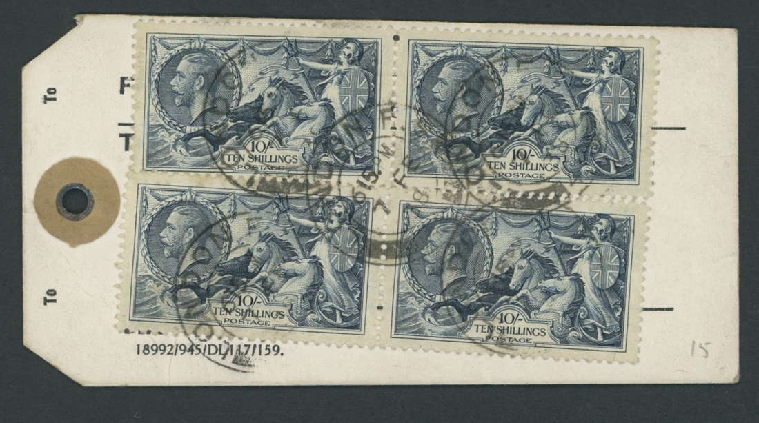 10/- indigo, two horizontal pairs, tied to parcel tag by London 07.02.38 d.s., the reverse with 1934-36 4d. and 1/- values.  Scarce.