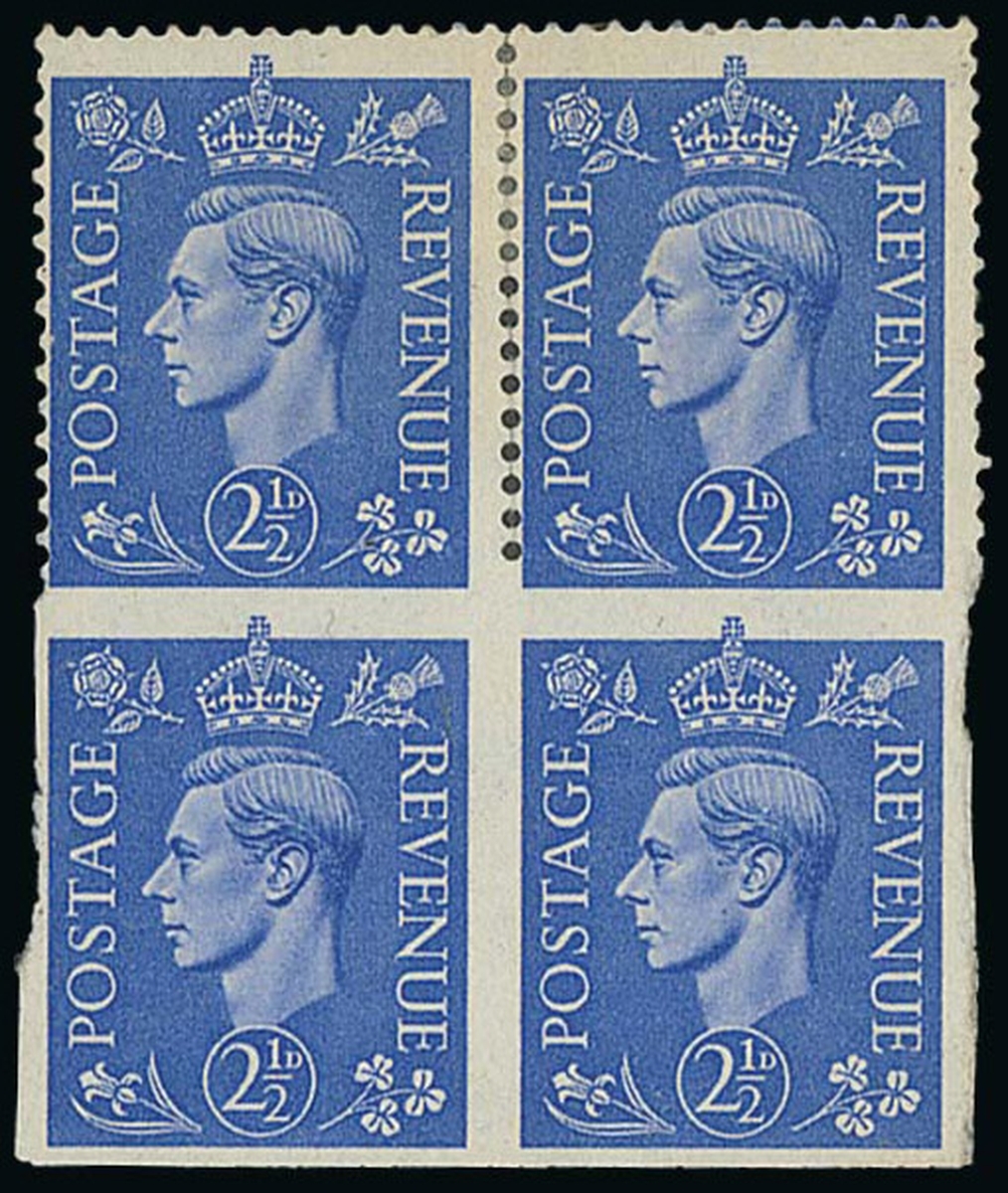 1941-42 2½d. block of four, variety imperforate on three sides, cut slightly roughly from the sheet at lower left otherwise fine, mounted on the upper pair only and lightly creased, otherwise fine and very rare. S.G. 489, 4893, £5,750++