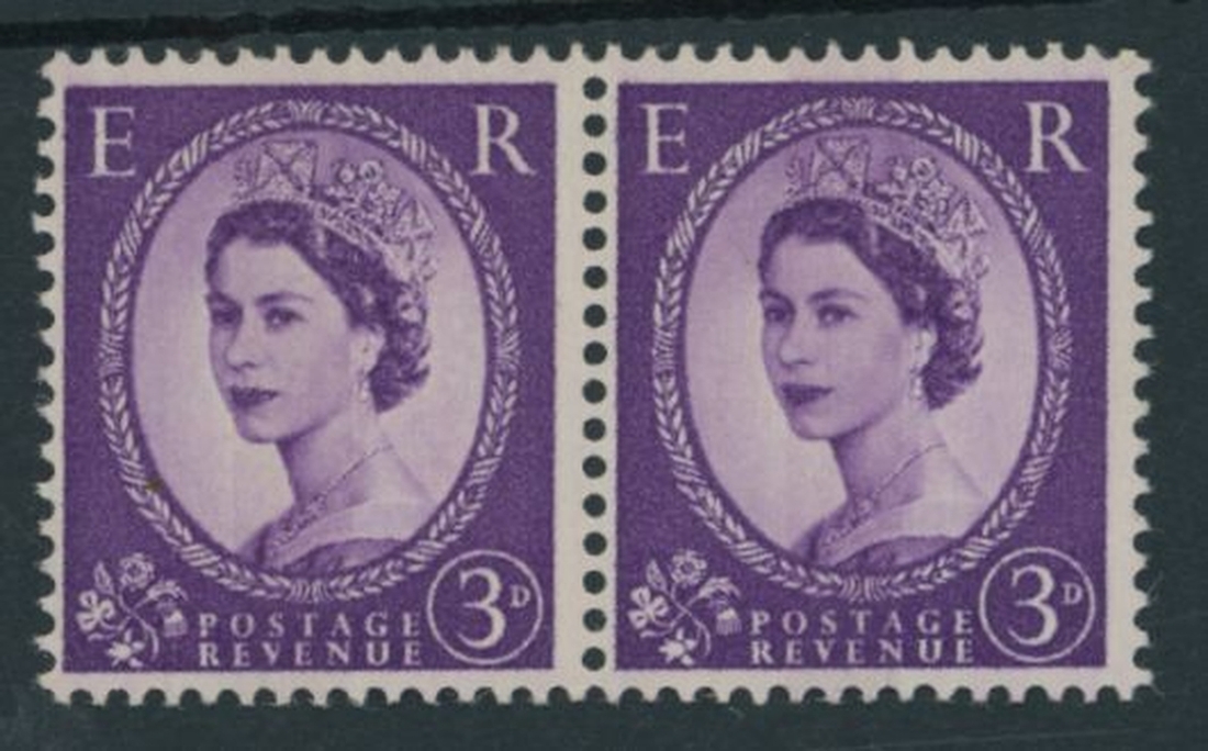 1959 3d. deep violet 'Dollis Hill Phosphor Trial', horizontal pair on gummed, watermark crowns (upright) paper, with one 4mm. phosphor centre band printed over the ink; unmounted, fine and scarce.  Spec. ST7(3)e