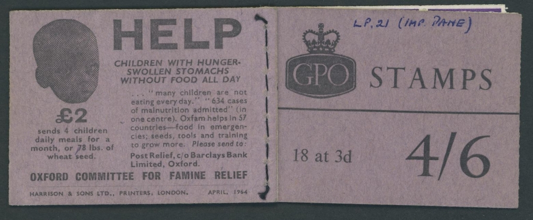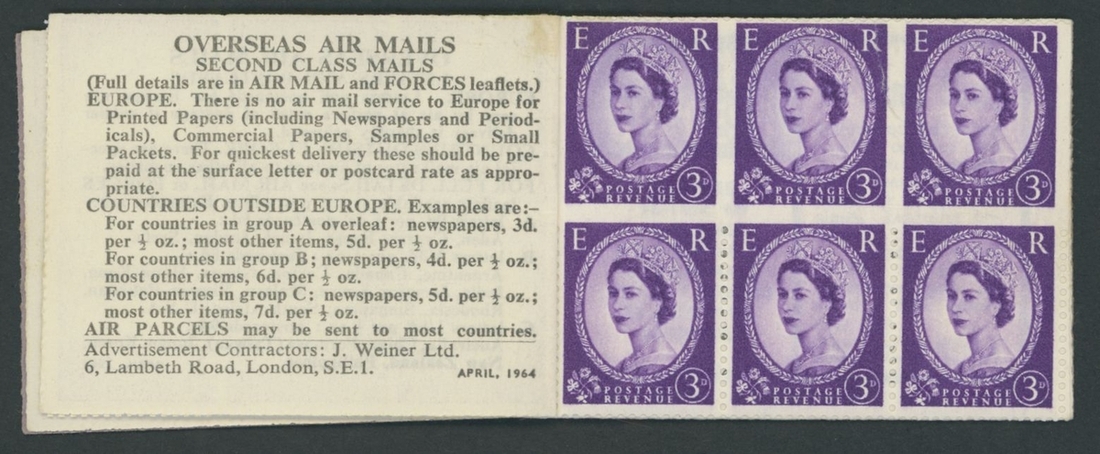 1964 4/6d. booklet, containing 3d. deep lilac panes (3), the second pane part imperforate (the upper strip of three), with a small tear caused by the original owner not realising the pane was imperforate, very rare. S.G. 575lc,  £1,200