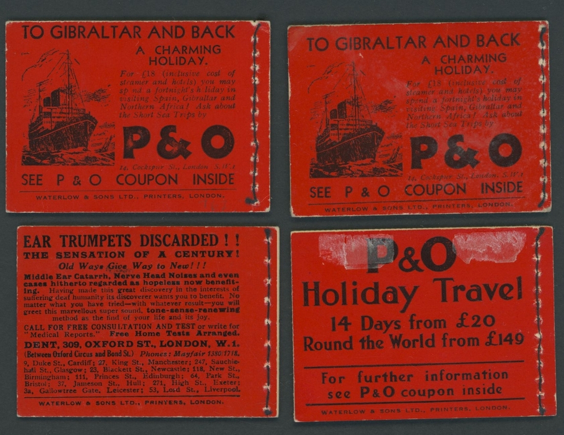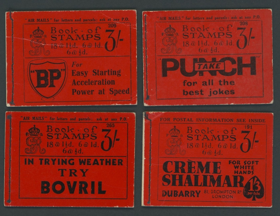 1924 (Feb.) 3/- black on scarlet booklets (4), serial numbers 191, 208, 209 and 265, all complete with three panes of 1½d., and one pane each of the 1d. and ½d.; front cover adverts include "Creme Shalimar", "Punch", "BP" and "Bovril".  Perfs. clipped as usual otherwise generally fine with few cover wrinkles. S.G. BB24,  £2,125