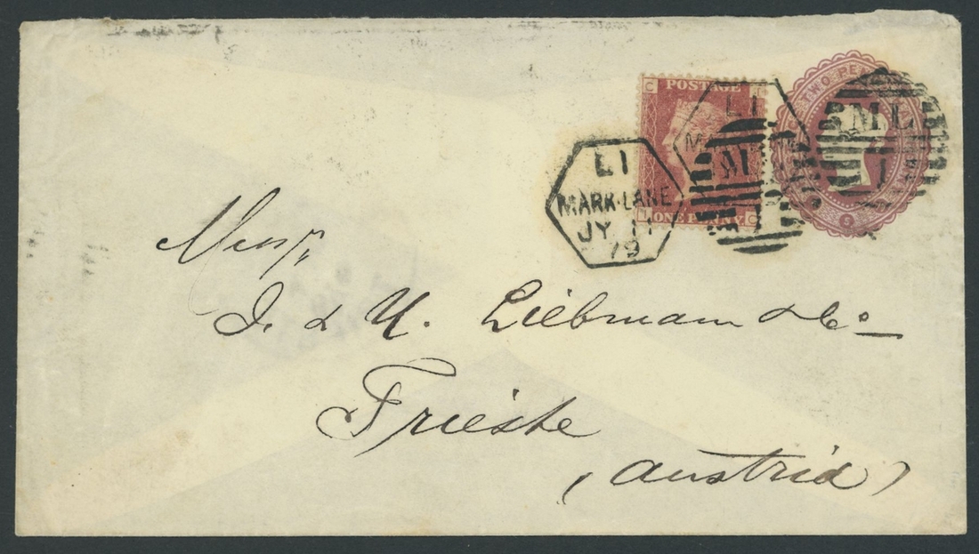 1879 ½d. postcard, additionally franked 1d., used from Glasgow to Bavaria, 1872 1d. pink envelope, additionally franked 1d. Plate 151, from London to Hamburg, 1894 1d. envelope additionally franked 1d. Plate 171, 1887½d. (2) Registered from Birmingham to Plymouth, 1879 2d. envelope, additionally franked 1d. Plate 187 from London to Austria; fine