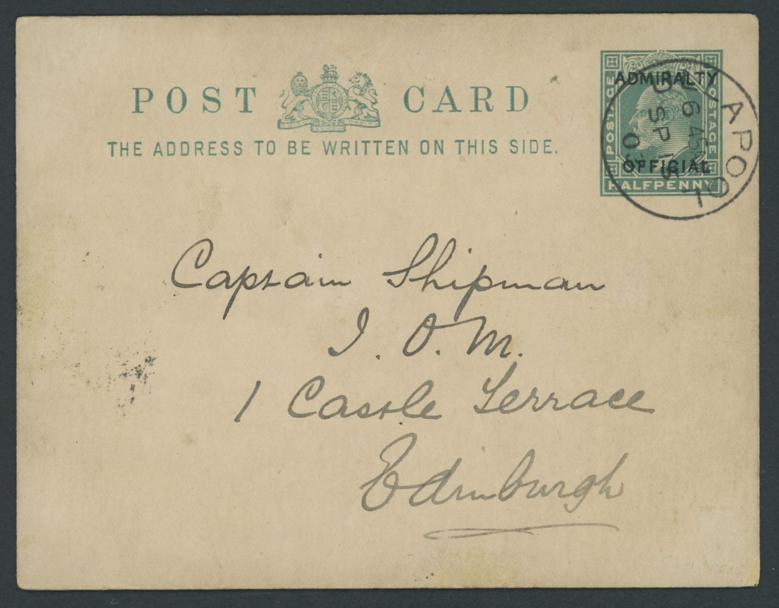 1903 (15 Sept.) KEVII Admiralty Official ½d. green post card to Edinburgh cancelled by well struck Ullapool single line d.s. Fine and scarce.