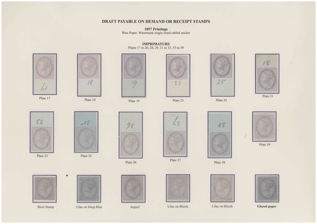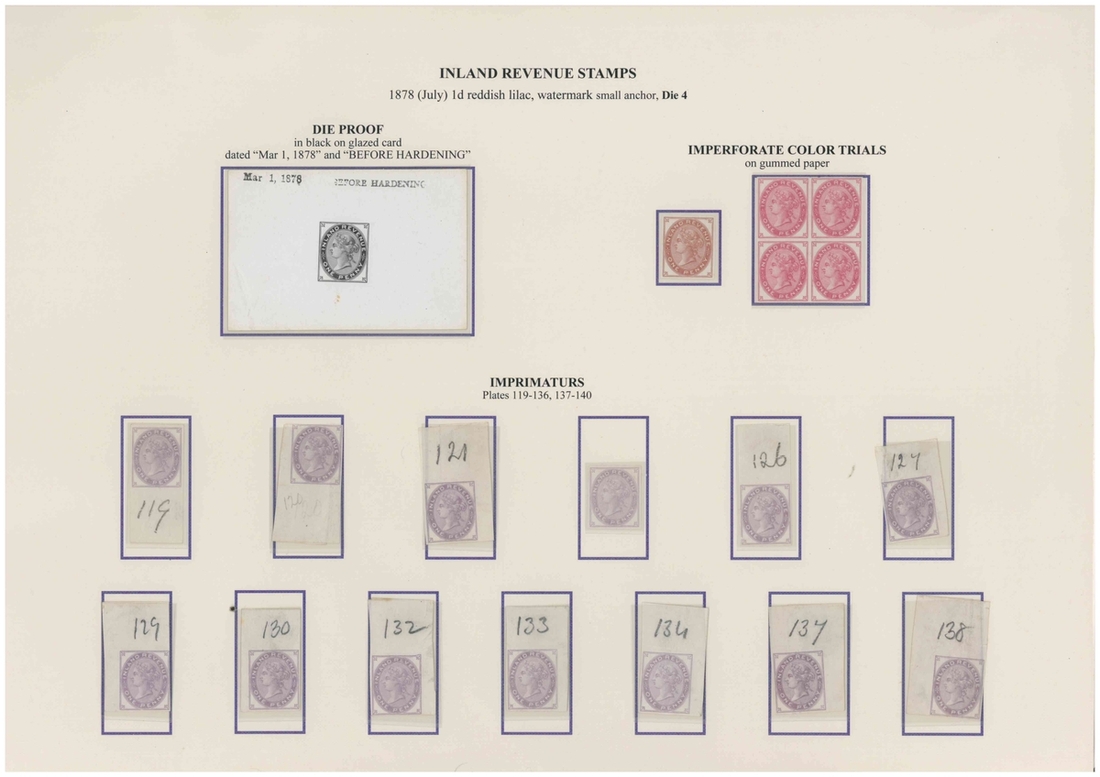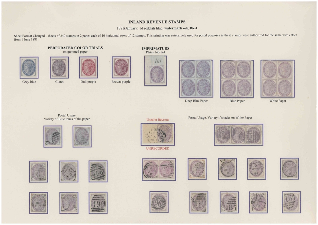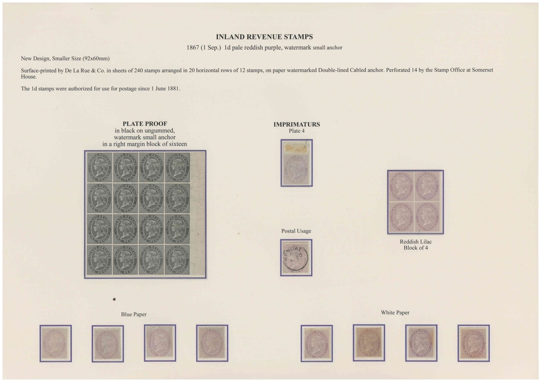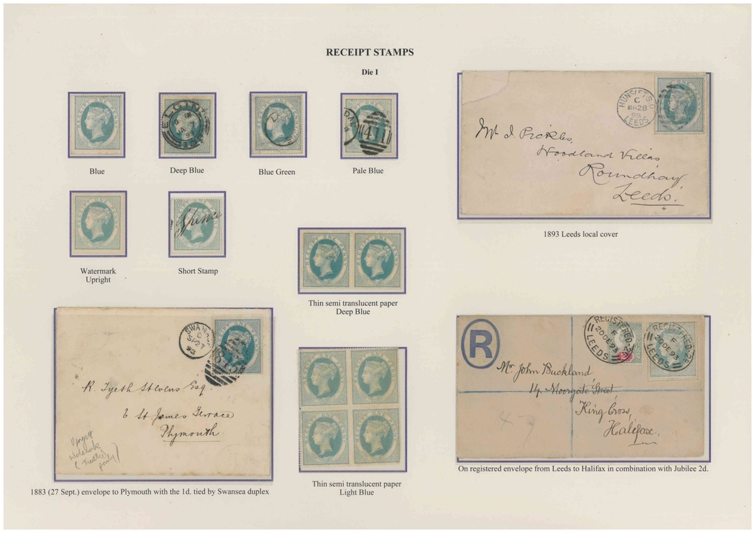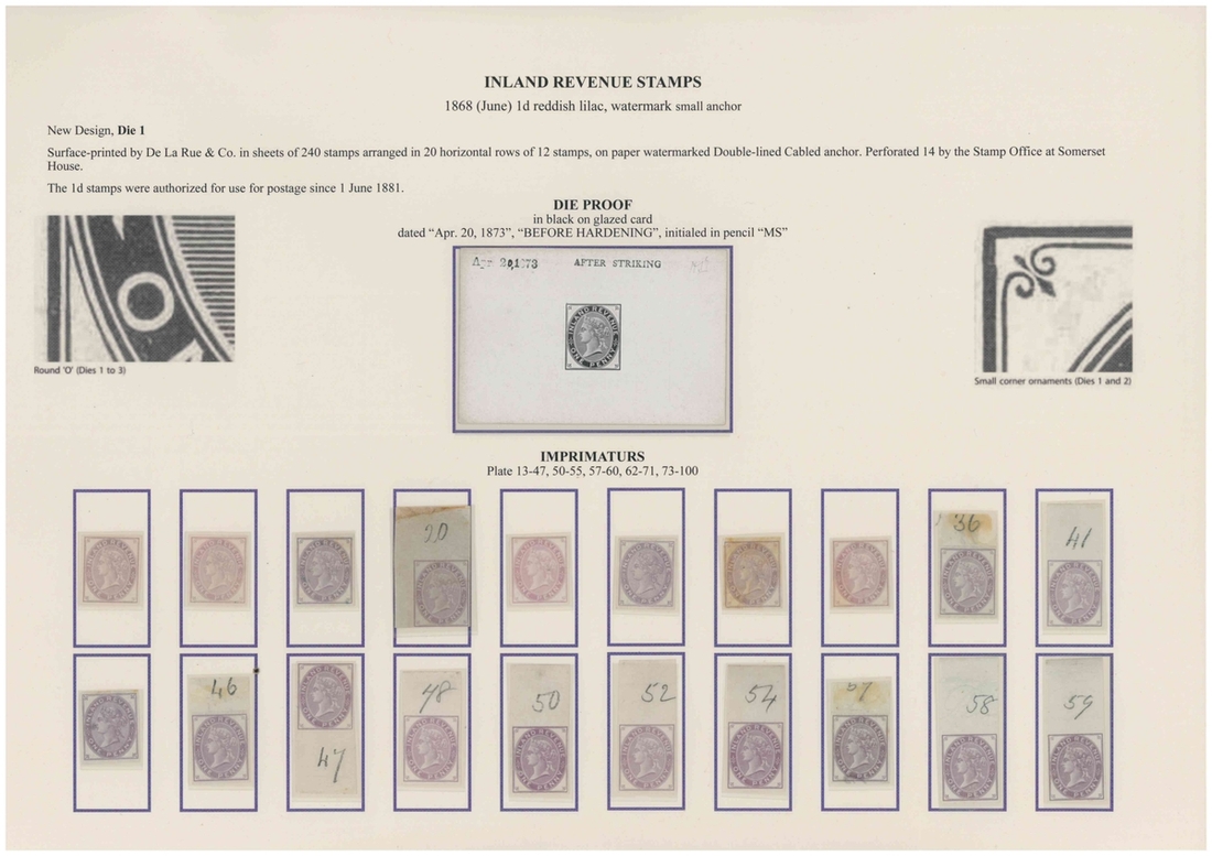 The valuable and comprehensive Collection, well written up on forty double exhibition pages,  including Receipt Stamps with Postal Notice "New Penny Receipt Stamp", 1853 Die I 1d. blue  imprimaturs from Plates 1, 2 and 4, also a single used on 1882 Liverpool local cover,  issued stamps with Thin semi-transparent paper (pair, block of four), Die II blocks of eight and twelve, blued paper used block of four, Draft Stamps, 1853 1d. ochre imprimaturs (2), issued stamps with block of four (2, one on semi-transparent paper), 1855 1d. reddish lilac imprimaturs (3), issued stamps with no watermark variety, 1856 1d. reddish lilac with imprimatur from Plates 11 and 12, 1857 1d. with imprimaturs from plates 17, 18, 19, 23, 25, 31, 33, 35, 36, 37, 38, 39, issued stamps with imperf. single, glazed paper, 1860 overprinted "