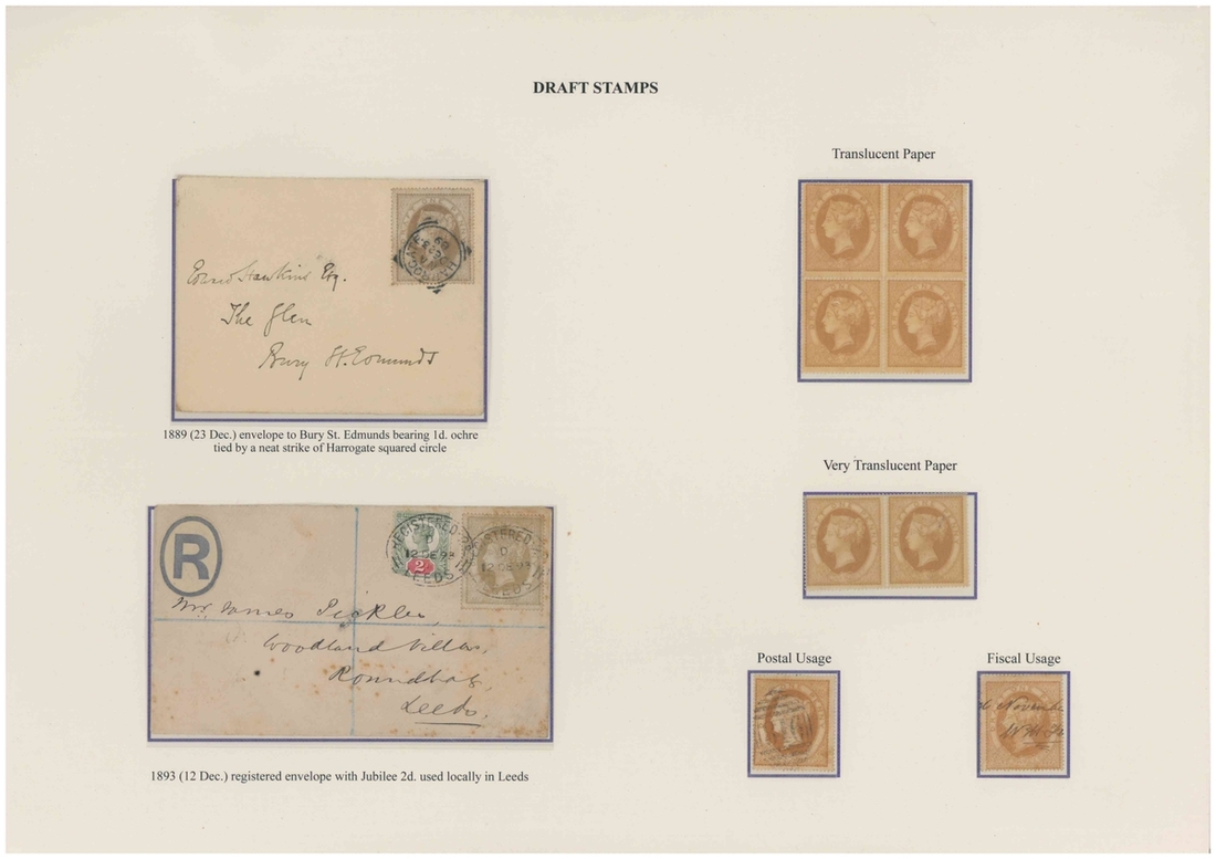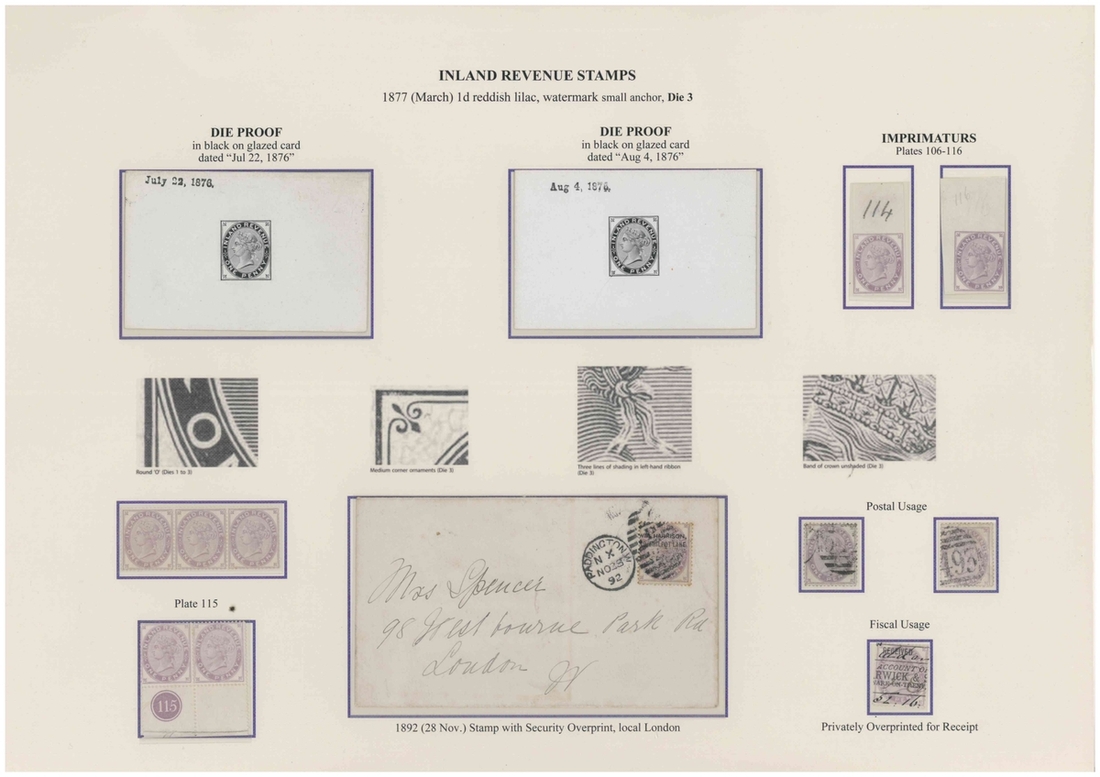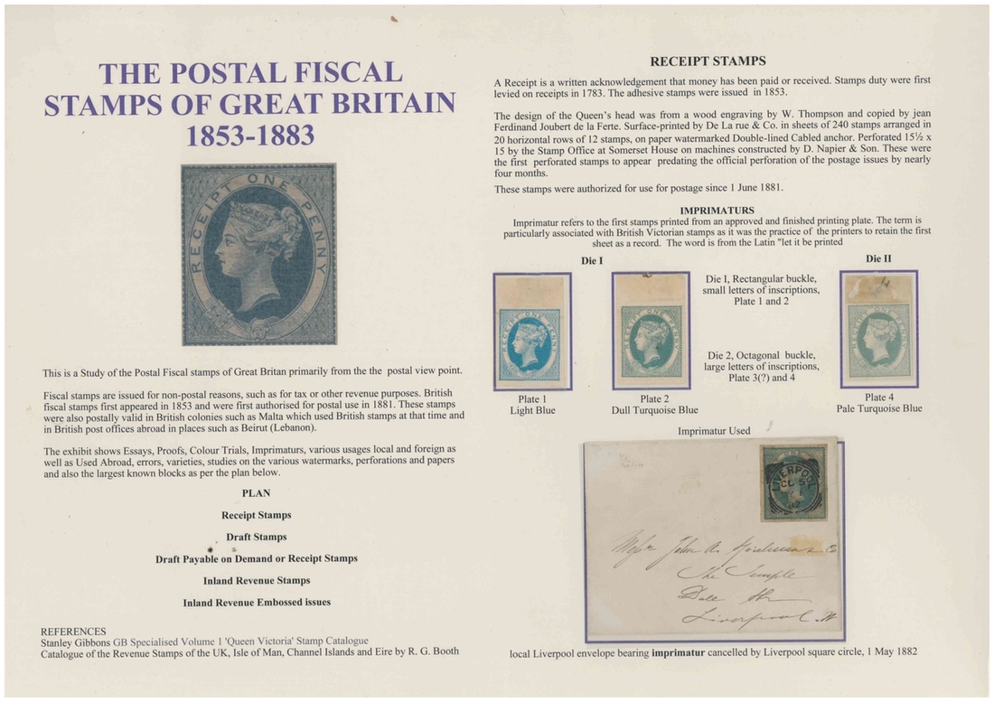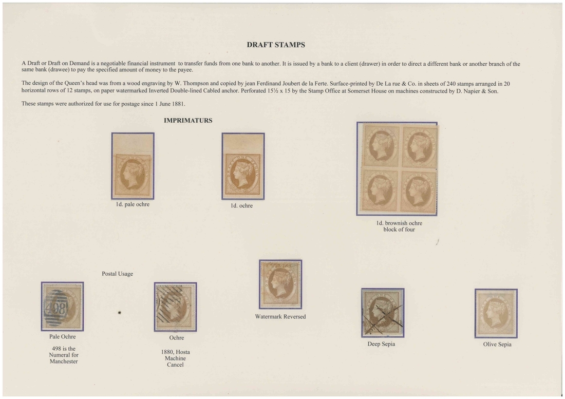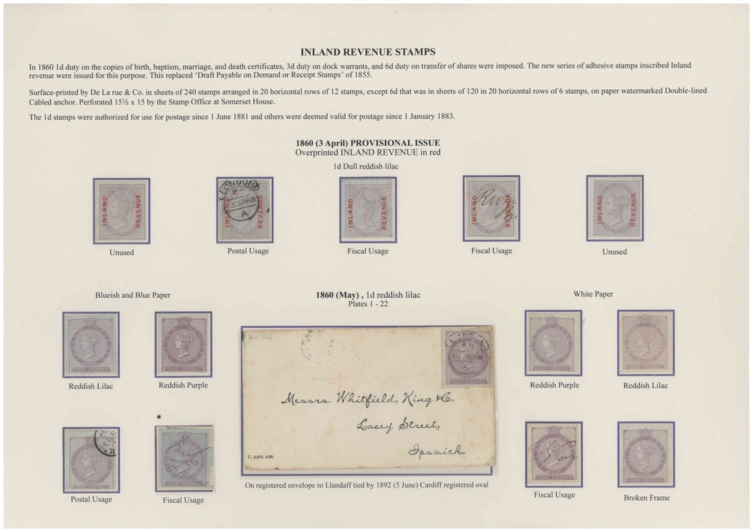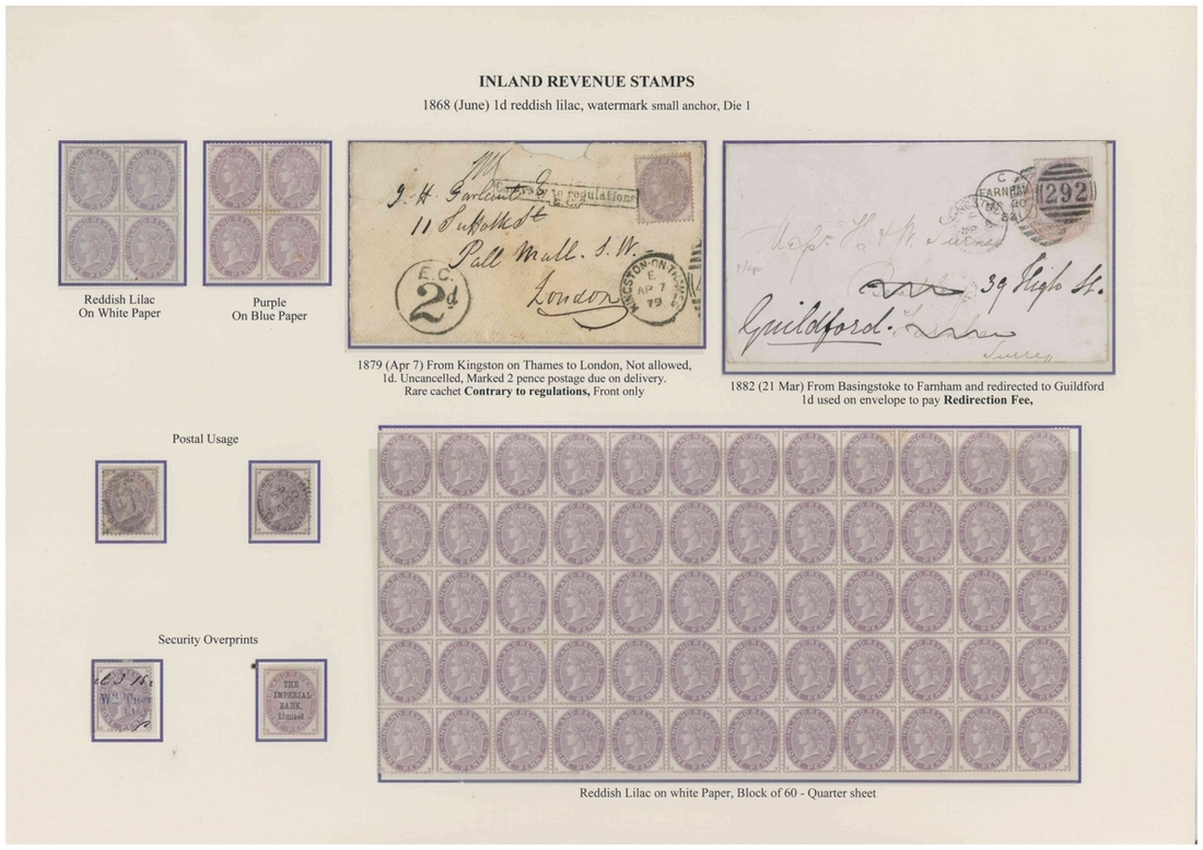 The valuable and comprehensive Collection, well written up on forty double exhibition pages,  including Receipt Stamps with Postal Notice "New Penny Receipt Stamp", 1853 Die I 1d. blue  imprimaturs from Plates 1, 2 and 4, also a single used on 1882 Liverpool local cover,  issued stamps with Thin semi-transparent paper (pair, block of four), Die II blocks of eight and twelve, blued paper used block of four, Draft Stamps, 1853 1d. ochre imprimaturs (2), issued stamps with block of four (2, one on semi-transparent paper), 1855 1d. reddish lilac imprimaturs (3), issued stamps with no watermark variety, 1856 1d. reddish lilac with imprimatur from Plates 11 and 12, 1857 1d. with imprimaturs from plates 17, 18, 19, 23, 25, 31, 33, 35, 36, 37, 38, 39, issued stamps with imperf. single, glazed paper, 1860 overprinted "
