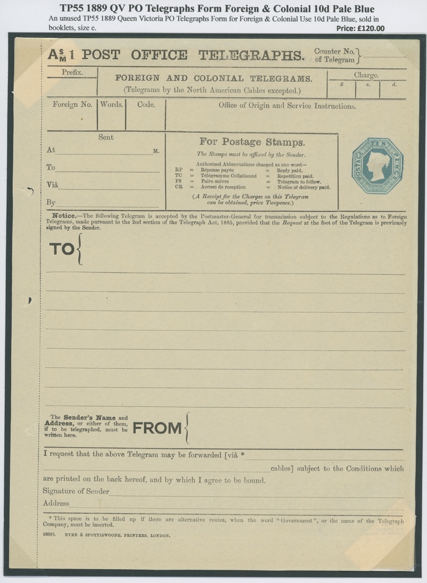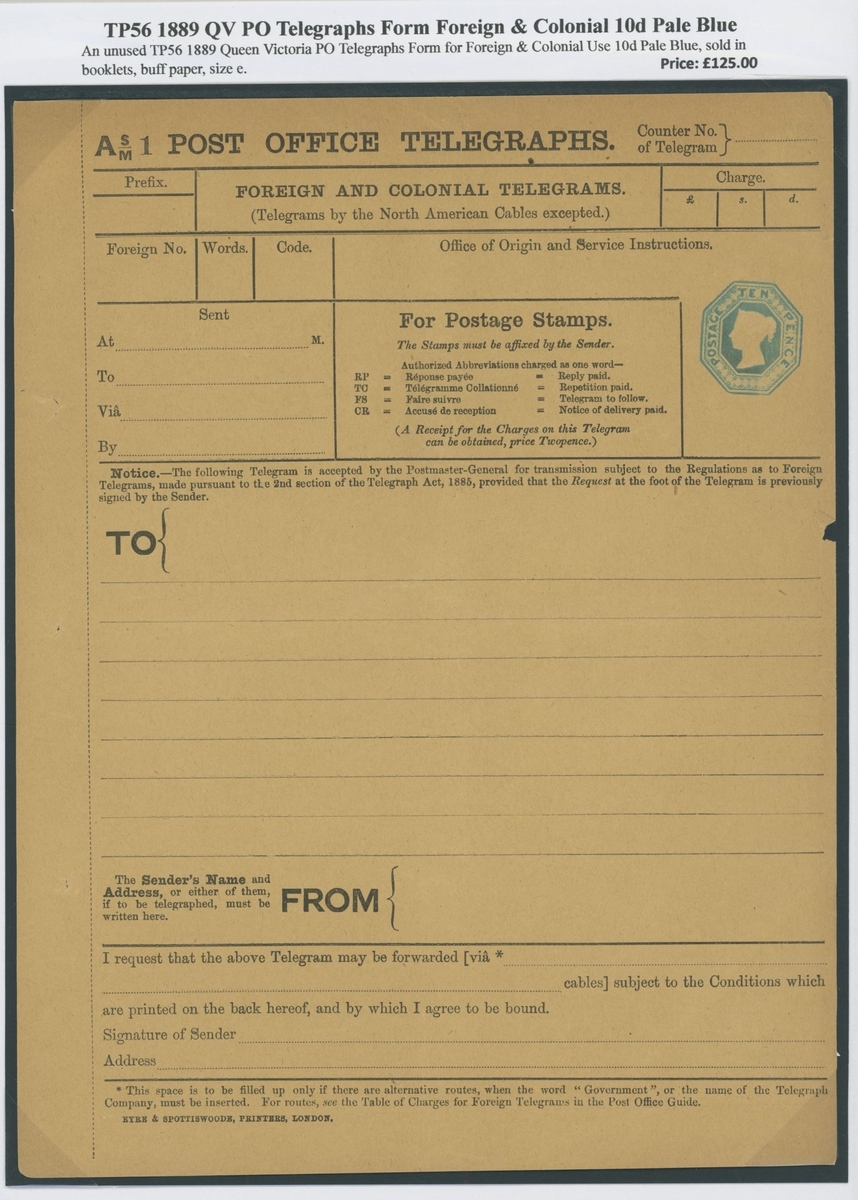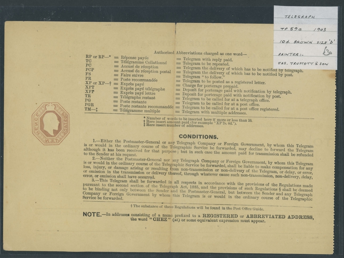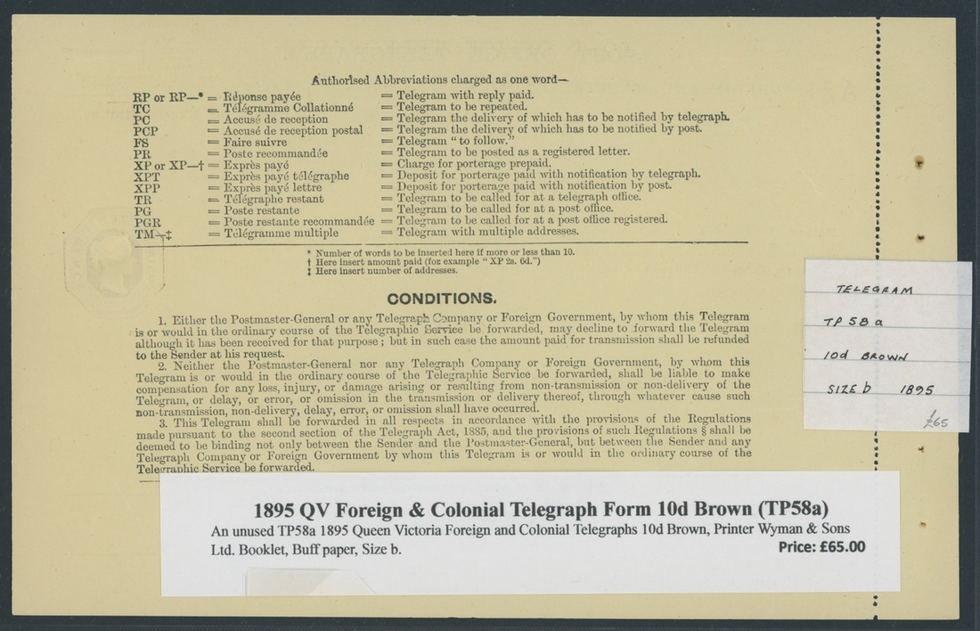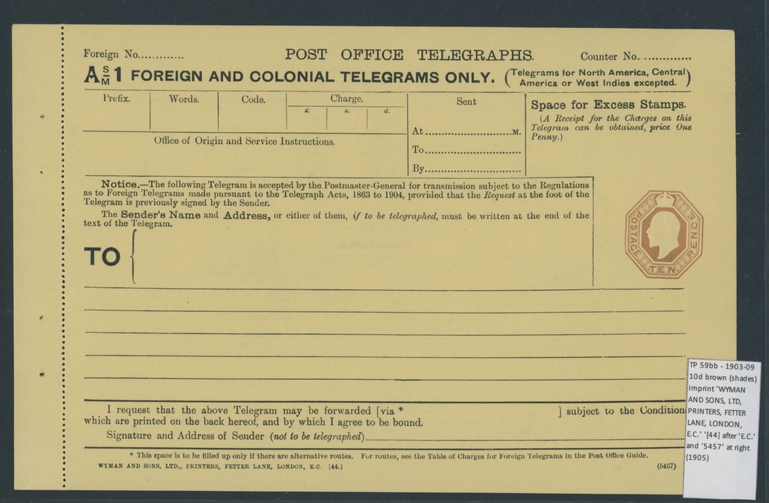 1889-1903, a selection of "Post Office Telegraphs" embossed forms including Queen Victoria 1889 10d. pale blue plain and on buff (TP55, 56), 1895 10d. brown size B (TP58a), King Edward VII 1904 6d. purple overprinted "