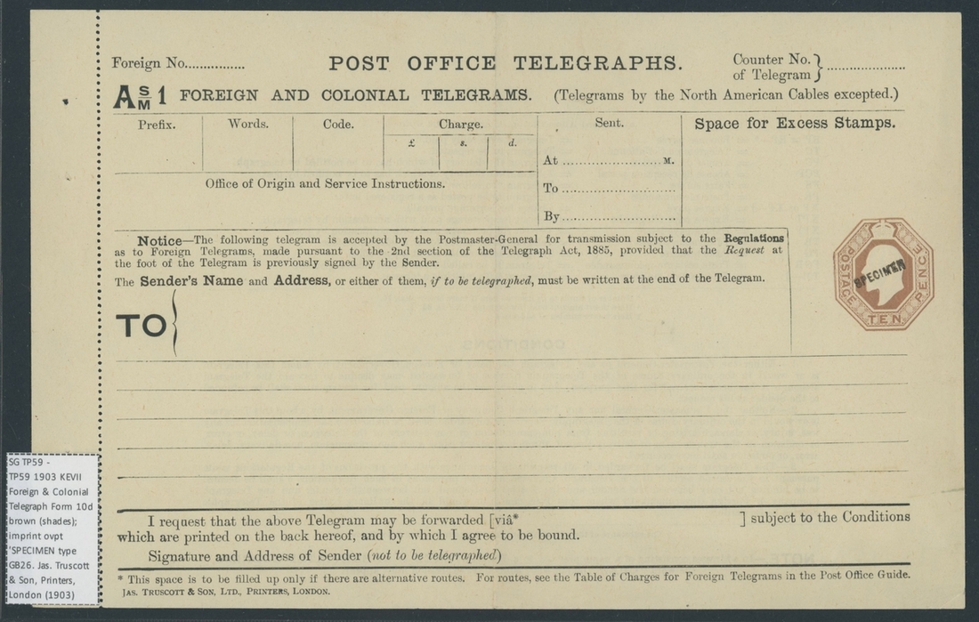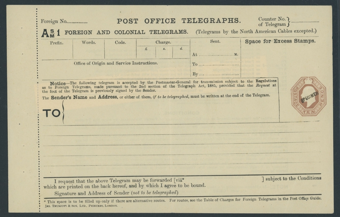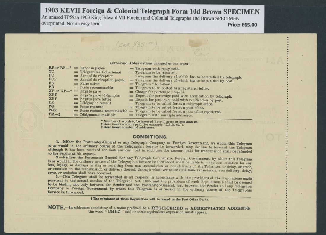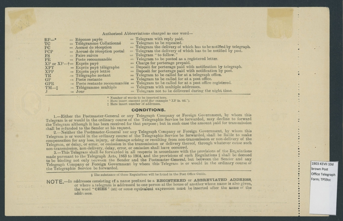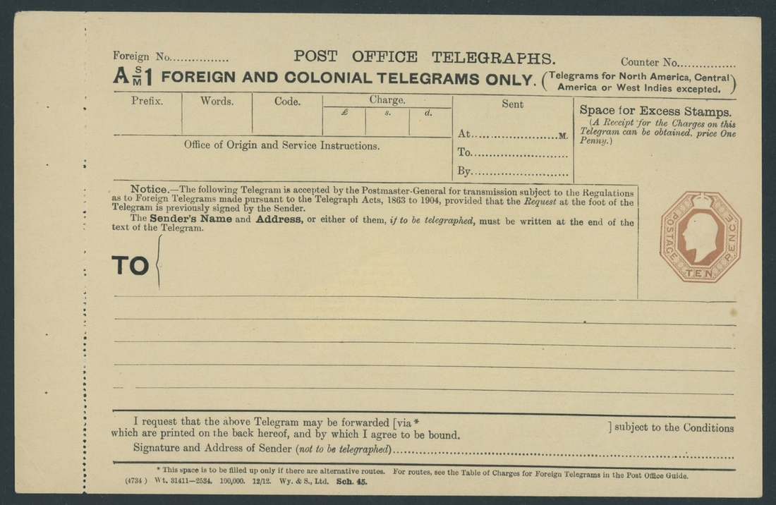 1889-1903, a selection of "Post Office Telegraphs" embossed forms including Queen Victoria 1889 10d. pale blue plain and on buff (TP55, 56), 1895 10d. brown size B (TP58a), King Edward VII 1904 6d. purple overprinted "