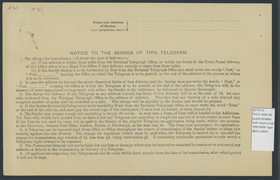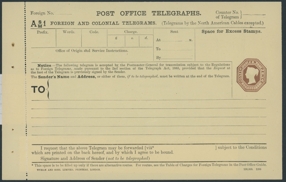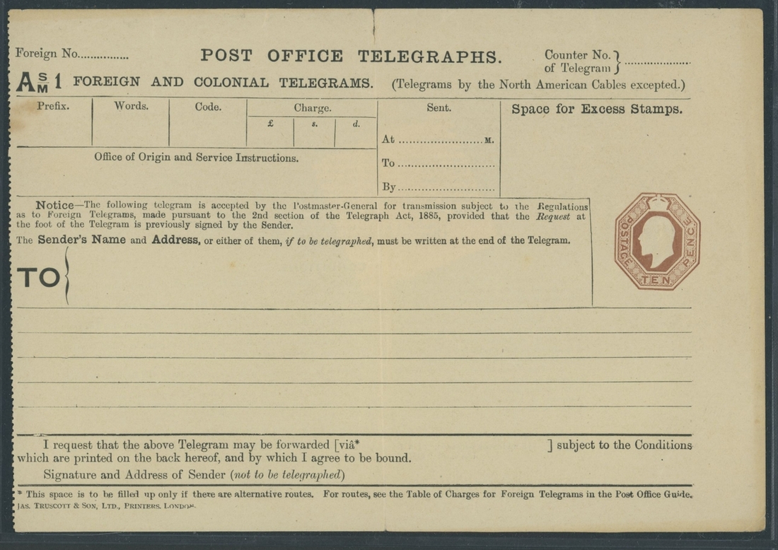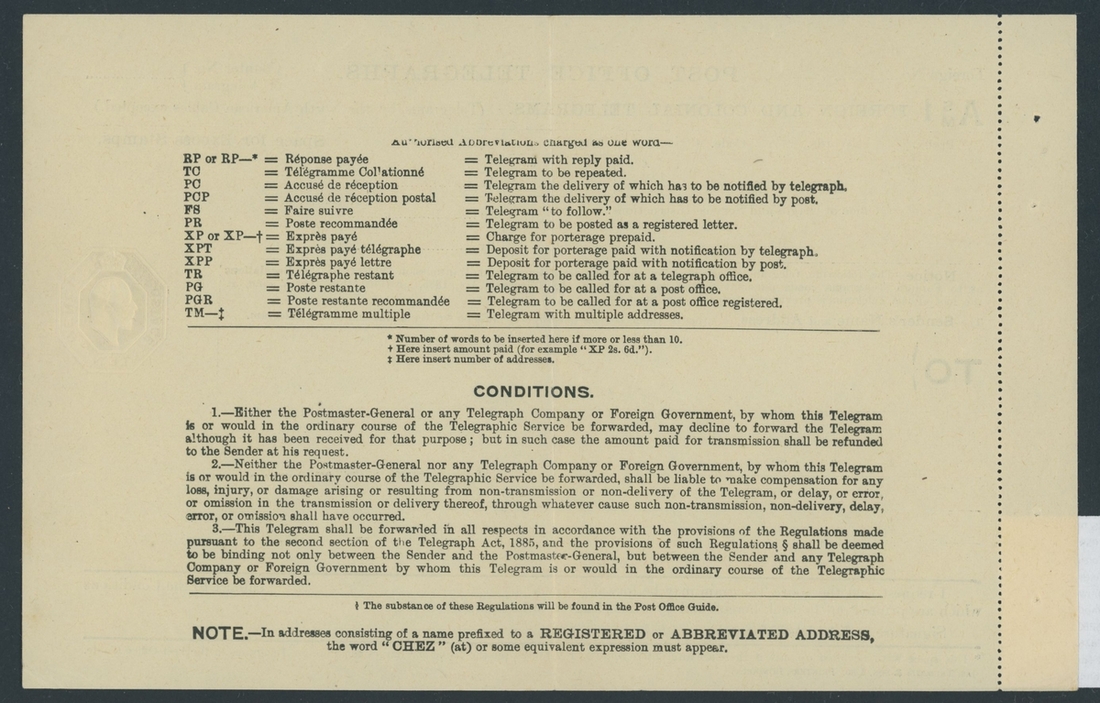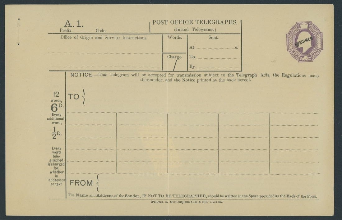1889-1903, a selection of "Post Office Telegraphs" embossed forms including Queen Victoria 1889 10d. pale blue plain and on buff (TP55, 56), 1895 10d. brown size B (TP58a), King Edward VII 1904 6d. purple overprinted "