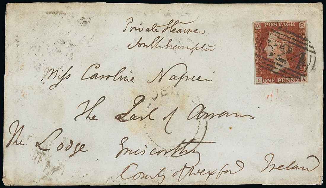 Alderney: undated front to Wexford, Ireland marked "Private Steamer, Southampton" bearing 1841-53 1d. red-brown (FA), clear margins tied by '324' of Guernsey with faint 'Alderney' undated double arc. Also two pieces, one with 1841-53 1d. red-brown horizontal pair (BG-BH), mostly clear margins, the other with single (DC) cut into at top, both with indistinct 324 barred numerals and good strikes of the 'Alderney' undated double arc.  A good group.
