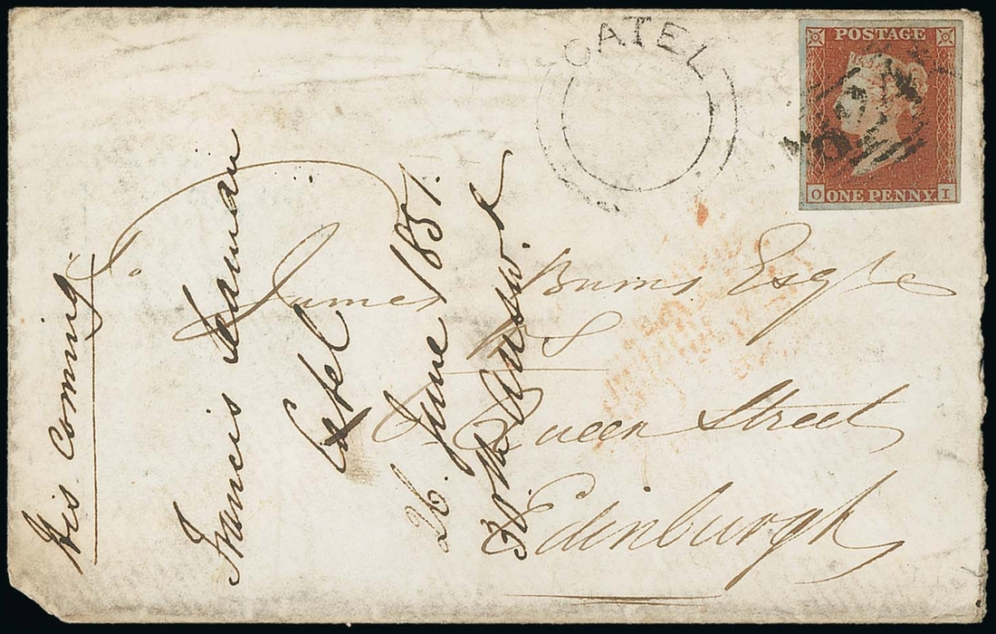 Catel: 1851 (26 June) envelope to Edinburgh bearing 1841-53 1d. red-brown (OI) with good margins all round, tied by '324' barred numeral of Guernsey, the envelope cancelled by 'Catel' undated double arc handstamp in black, the reverse with Guernsey 27.06 blue d.s., and receiving / transit marks for 28.06, 29.06 d.s. in red and black. Envelope a little foxed and roughly opened though an enormously rare mark, there being only five known in this colour, and six in total.
