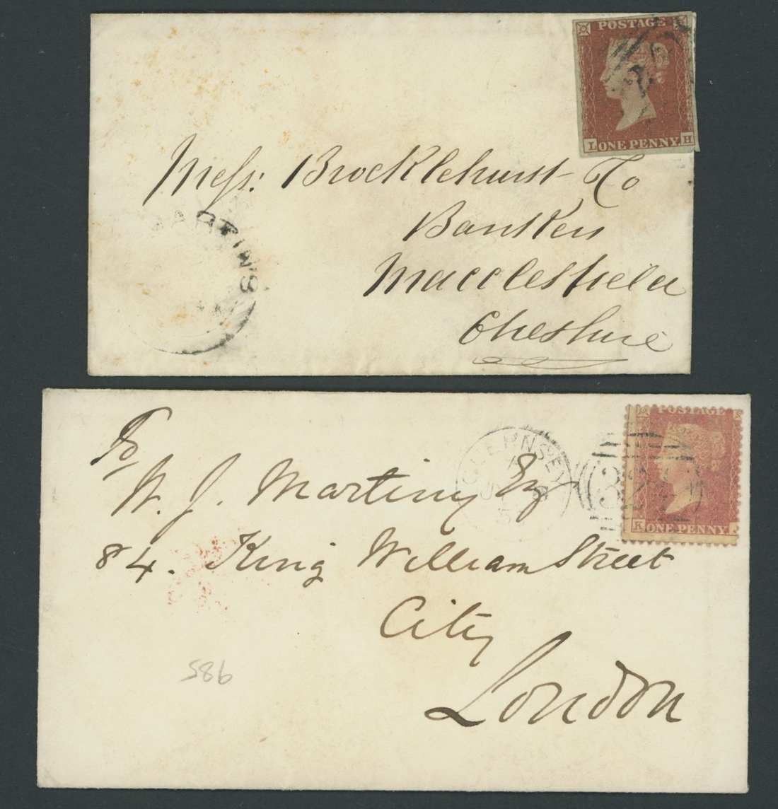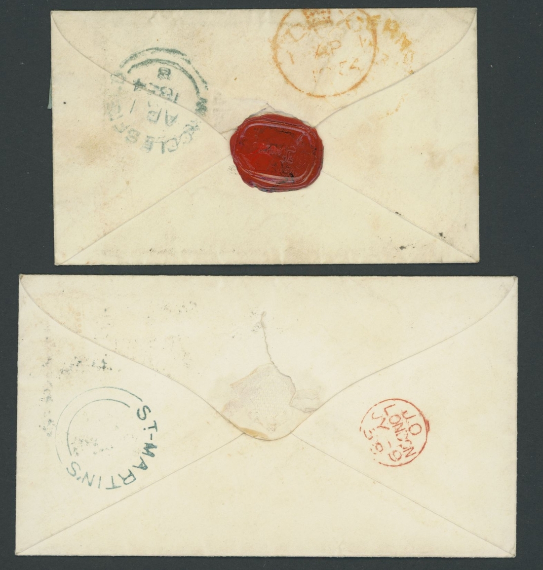 St. Martin's: 1854 (1 April) envelope to Macclesfield bearing 1841-53 1d. red-brown (LH) with clear margins all round, small nick in lower right margin, tied by '324' barred numeral of Guernsey, the envelope struck with 'St. Martin's' undated double arc d.s., the reverse with Guernsey, London and Macclesfield d.s. Also 1858 (6 July) envelope bearing perforated 1d. red tied by Guernsey duplex, the reverse with 'St. Martin's' undated double arc handstamp in blue alongside London 09.07 d.s., very fine. A rare duo.